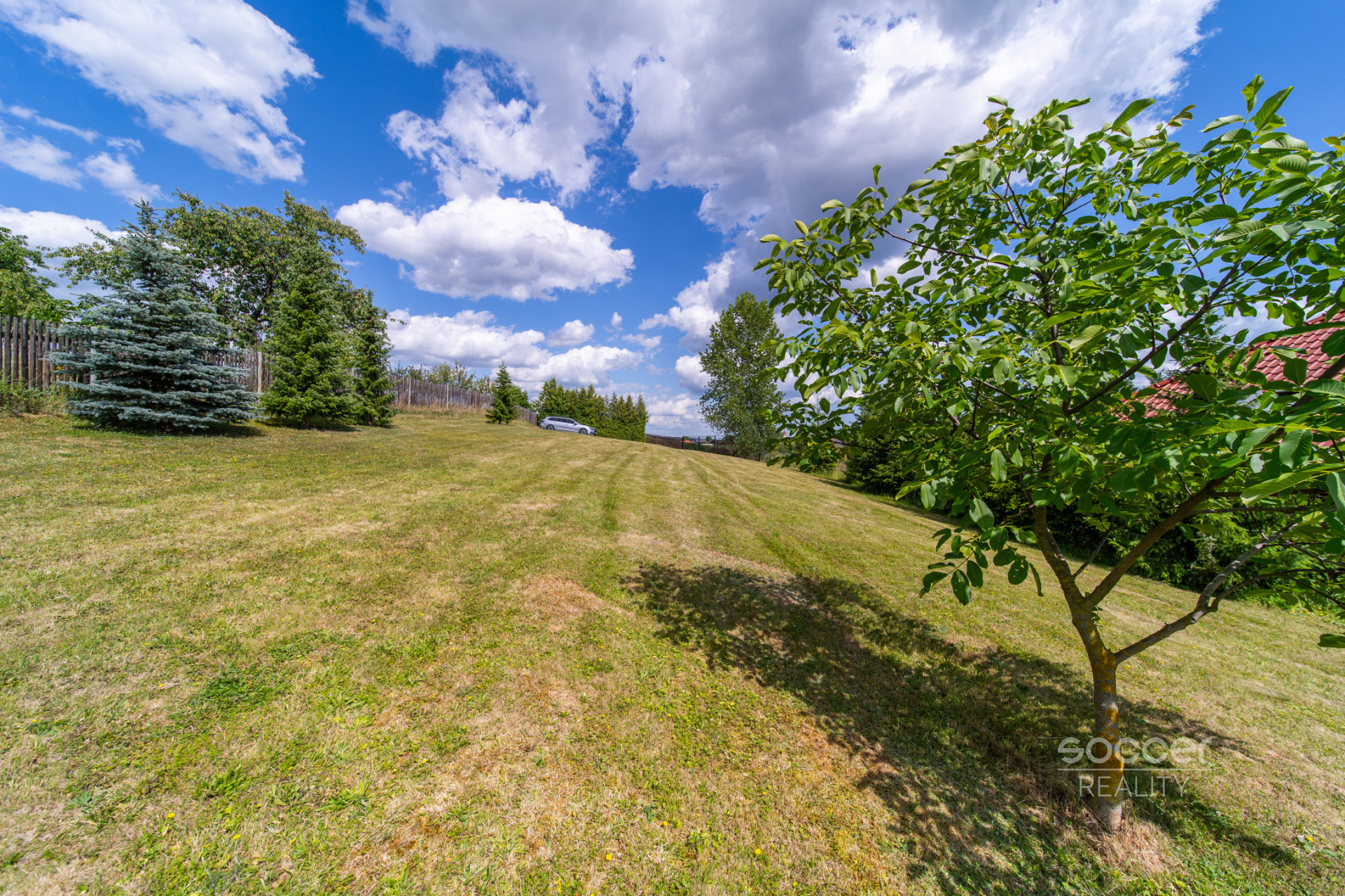 Mírně svažitá udržovaná zahrada vám poskytne hezký výhled do zvlněné okolní krajiny i dostatek soukromí. Můžete se zde v klidu opalovat, zapinkat si třeba badminton nebo zacvičit jógu, jen tak posedět v trávě nebo se zasnít při praskání dřeva v ohništi.