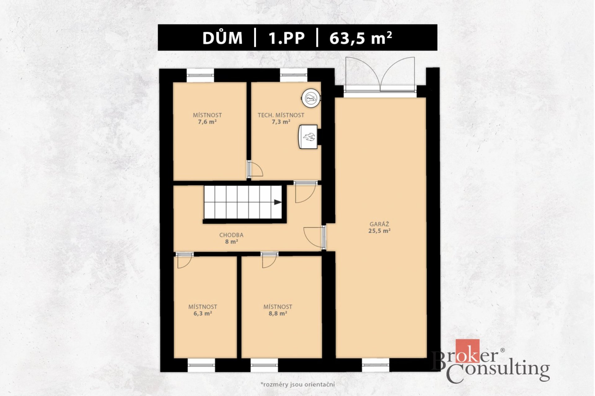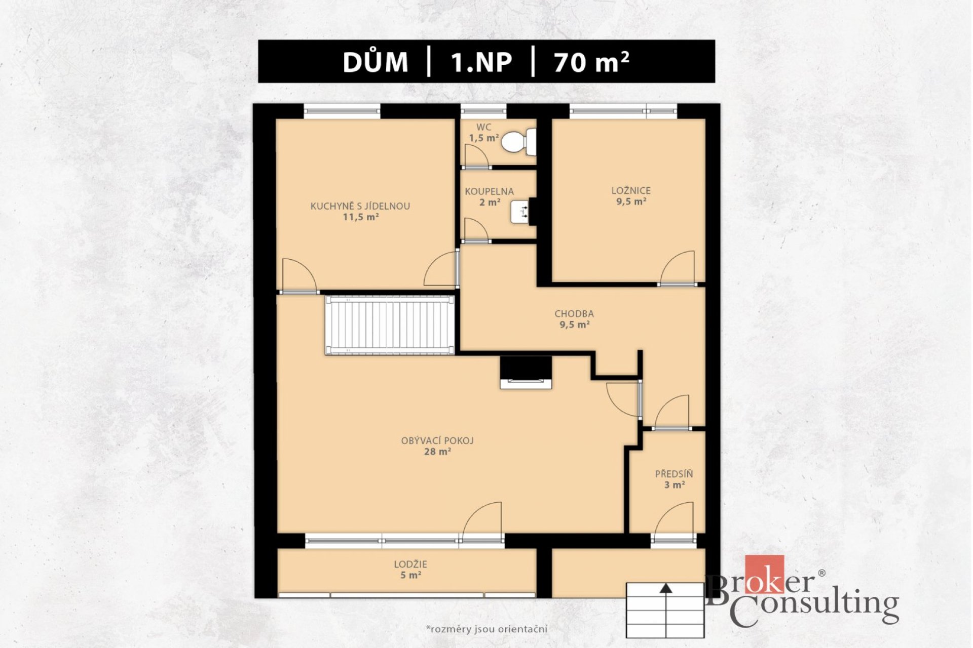 Nemovitost má dvě nadzemní podlaží – první o dispozici 2+1 a druhé o dispozici 3+1.