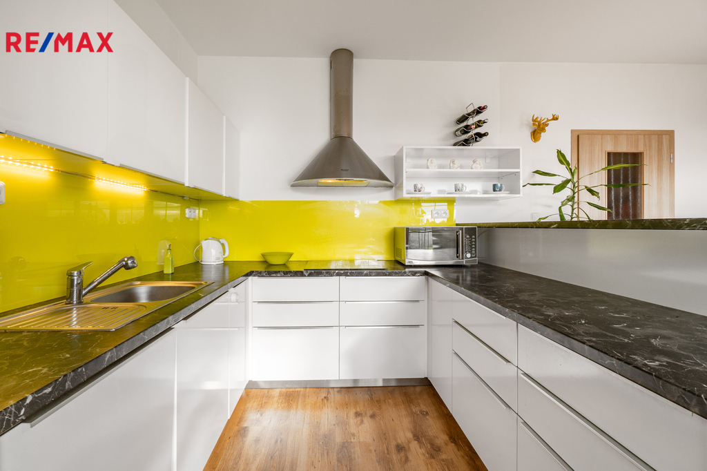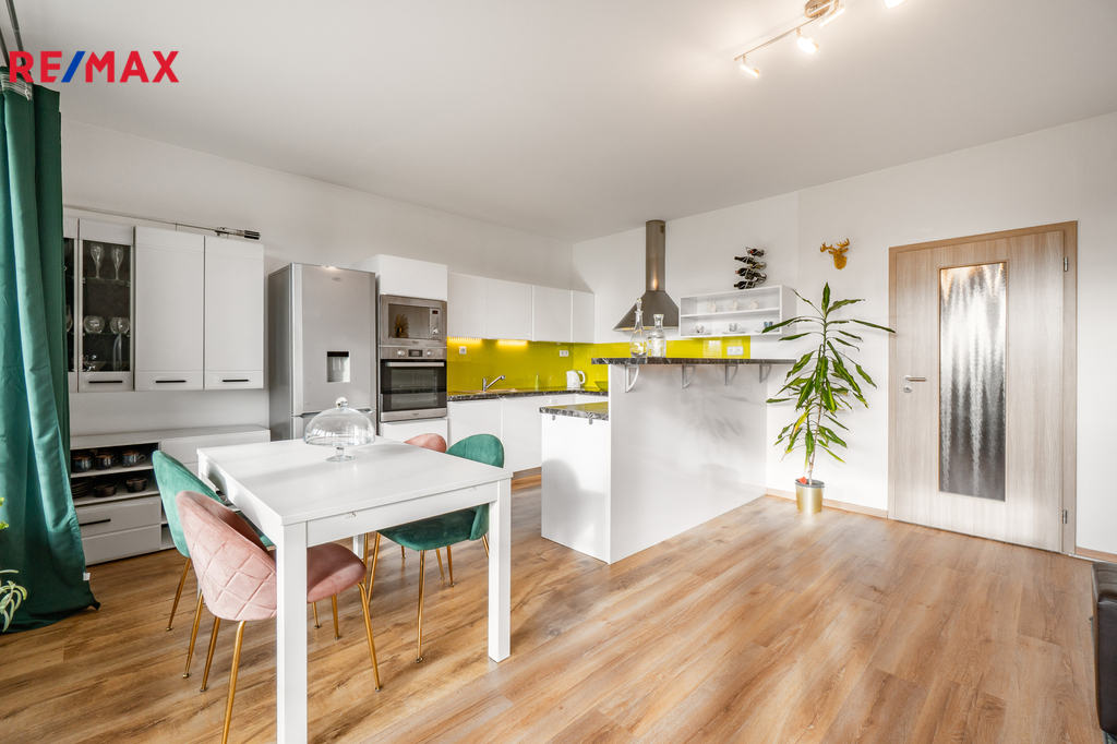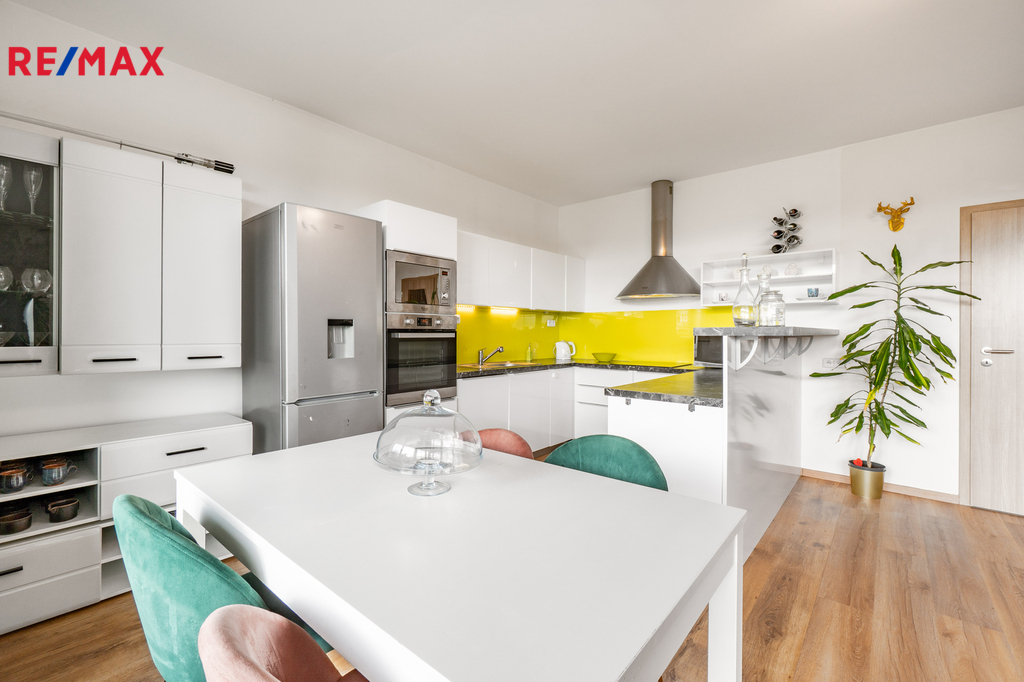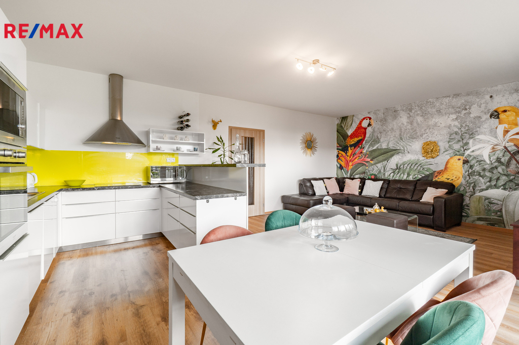 - Prostorný obývací pokoj s kuchyňským koutem (34 m²) a vstupem na jižní balkon (11,2 m²)