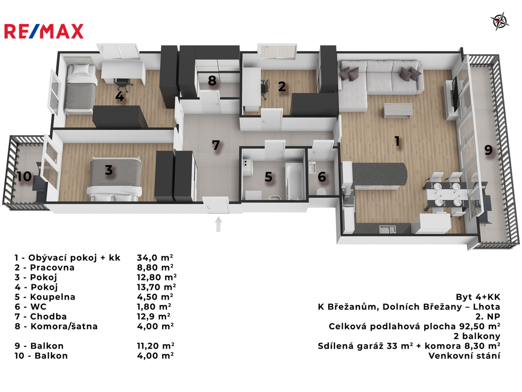 Prostorný byt 4+kk 92,5m2, s garáží, venkovním parkováním a dvěma balkony – Dolní Břežany, Lhota