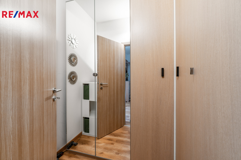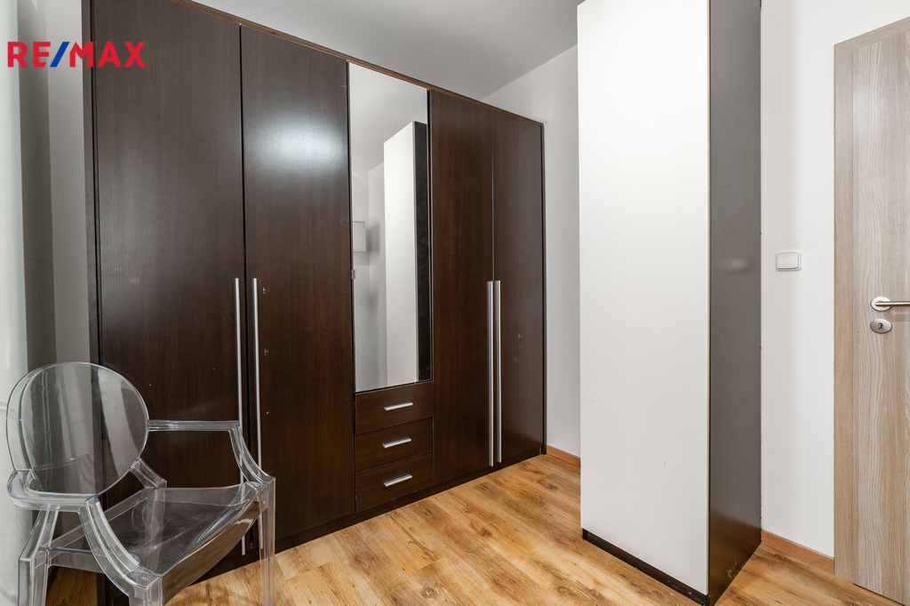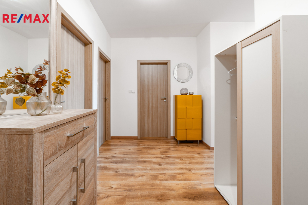 - Chodba (12,9 m²) a šatna (4 m²) s úložnými prostory