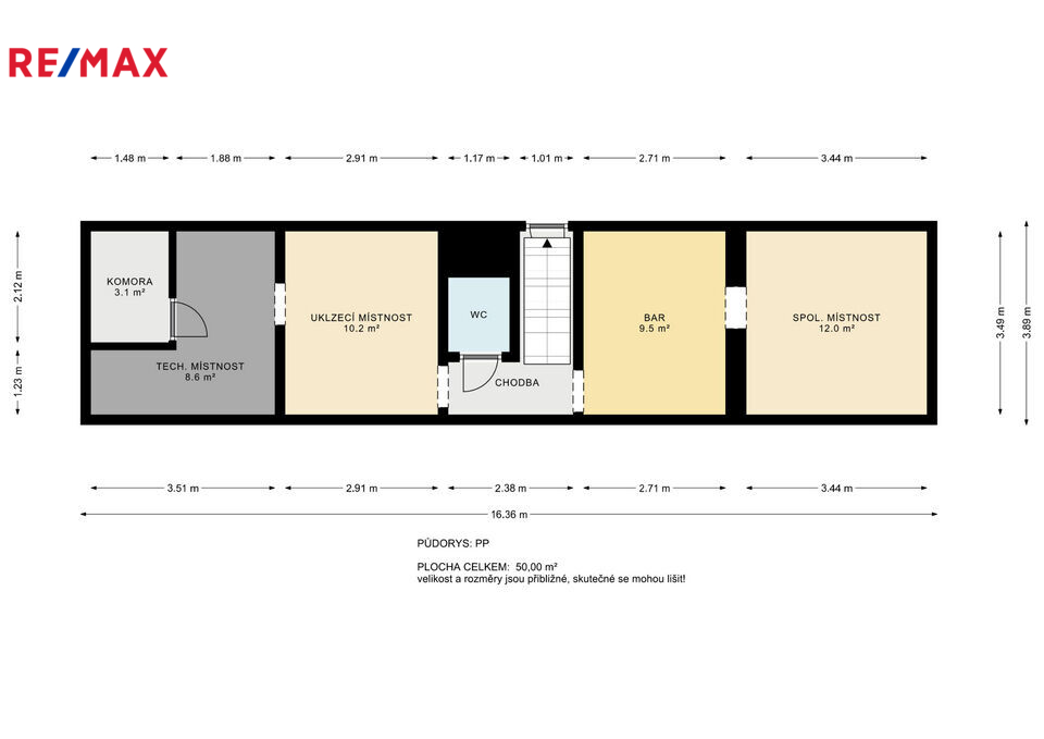 V suterénu nemovitosti se nachází technická a úklidová místnost, bar, se společenskou místností, celková UP činí 50 m2.