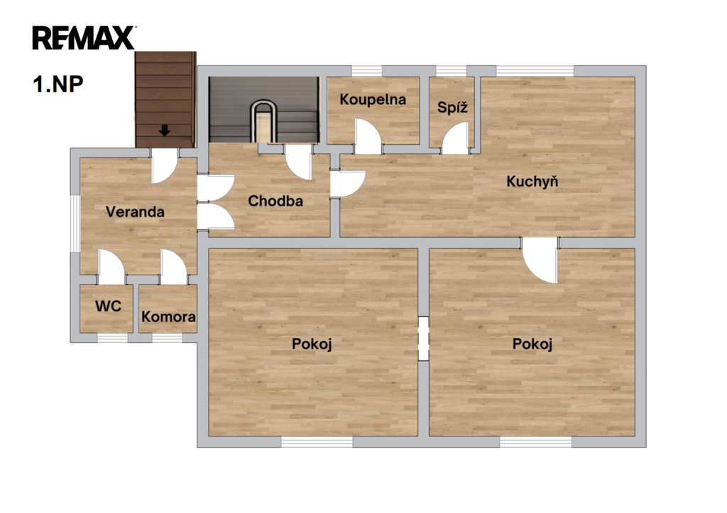 V 1.NP se nachází bytová jednotka 3+kk o podlahové ploše cca 83 m². Ze zádveří můžeme vstoupit do chodby a dále do kuchyně, nebo do 2.NP. Žádné zbytečné haly nebo prostorné chodby - vše účelné a jednoduché. Z kuchyně vstup do koupelny nebo obývacího pokoje a dále do ložnice.
