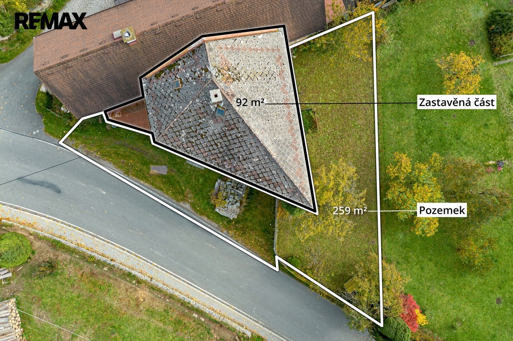 Pozemek celkem 351m² (zastavěná plocha 92 m², zahrada 154 m², ostatní plocha před domem 105 m²)