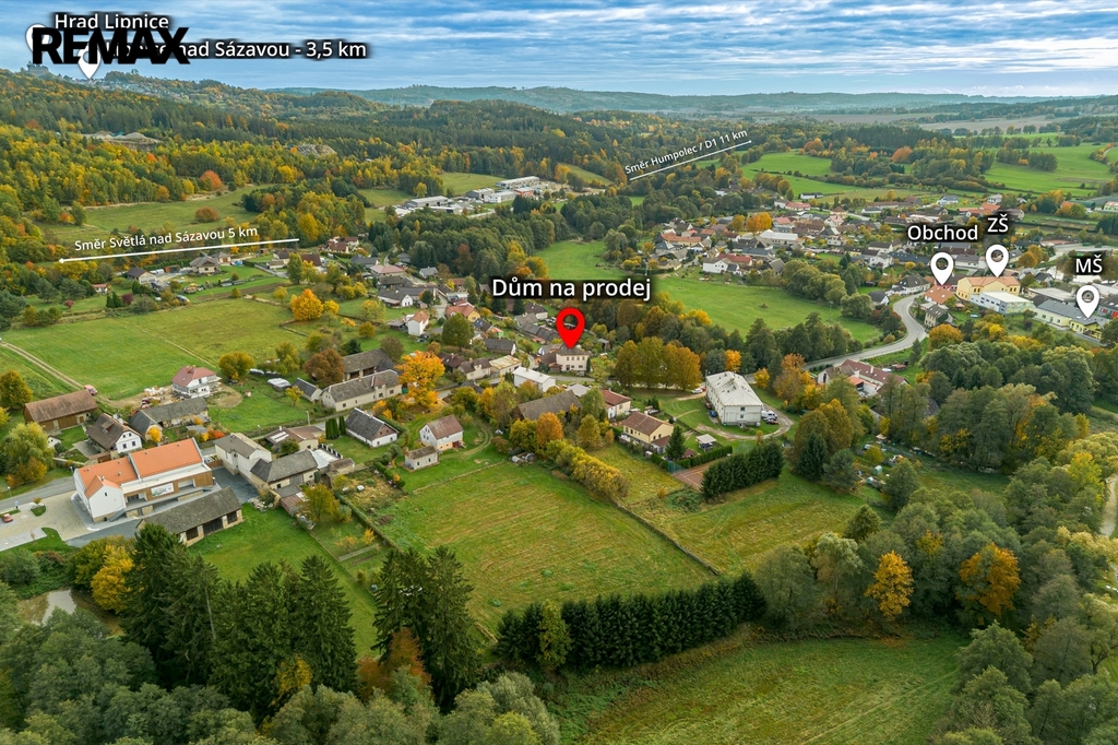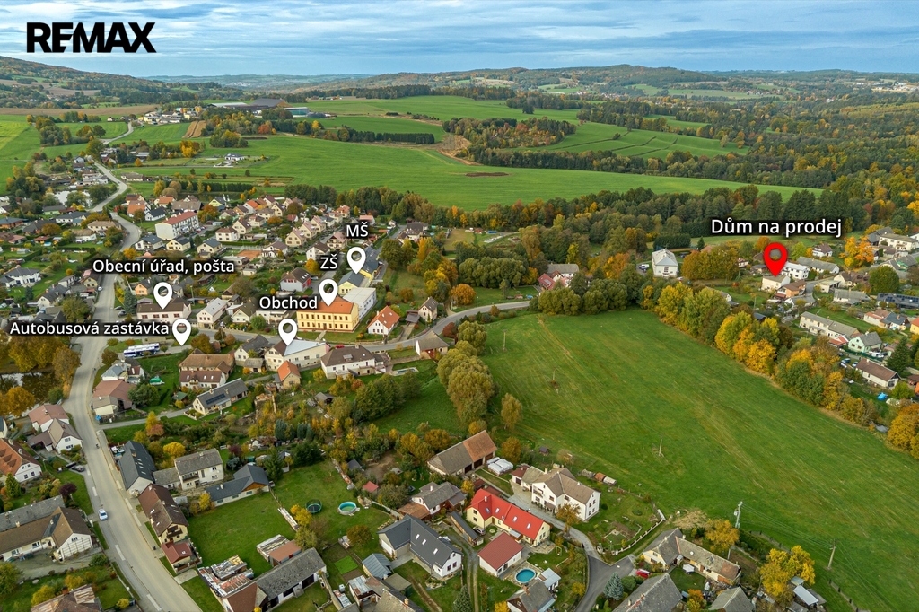 Veškerá občanská vybavenost do 5 minut pěšky – základní a mateřská škola, obchod, pošta, obecní úřad, autobusová zastávka