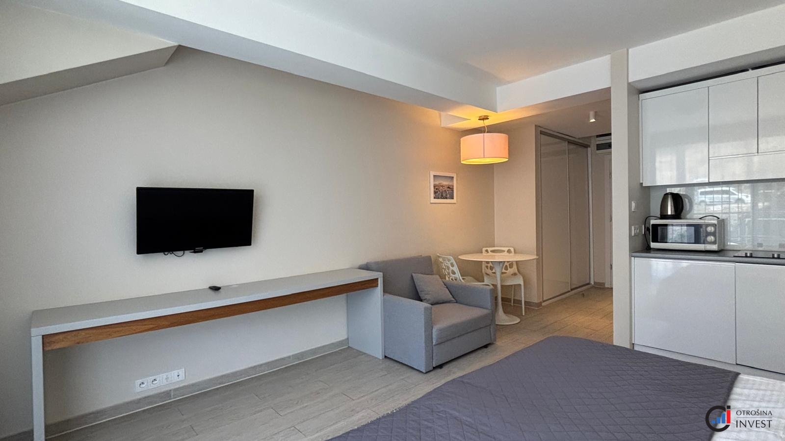 Apartmán sestává z obývacího pokoje s kuchyňským koutem, předsíně, koupelny a balkonu. Nábytek a vybavení jsou součástí ceny.