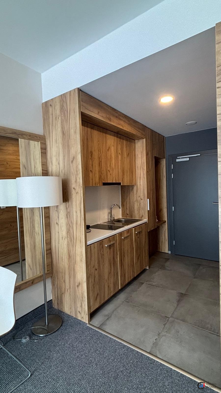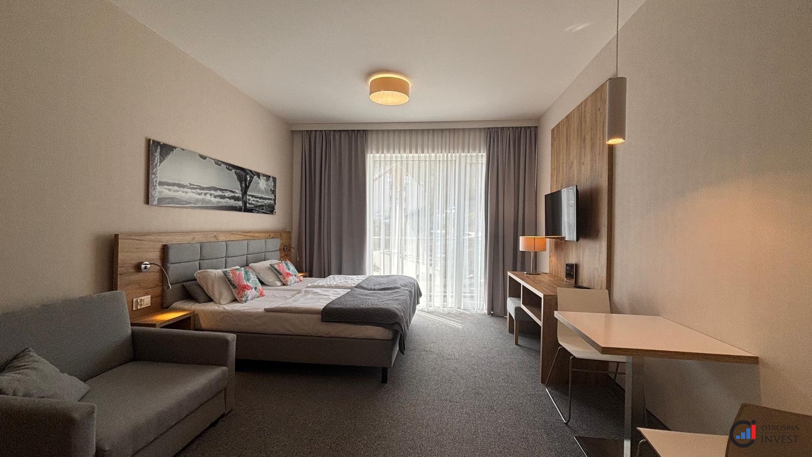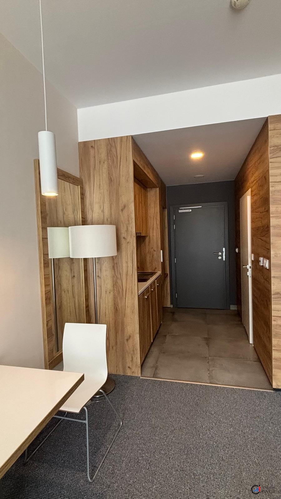 Apartmán sestává z obývacího pokoje s kuchyňským koutem, předsíně, koupelny a balkonu. Nábytek a vybavení jsou součástí ceny.
