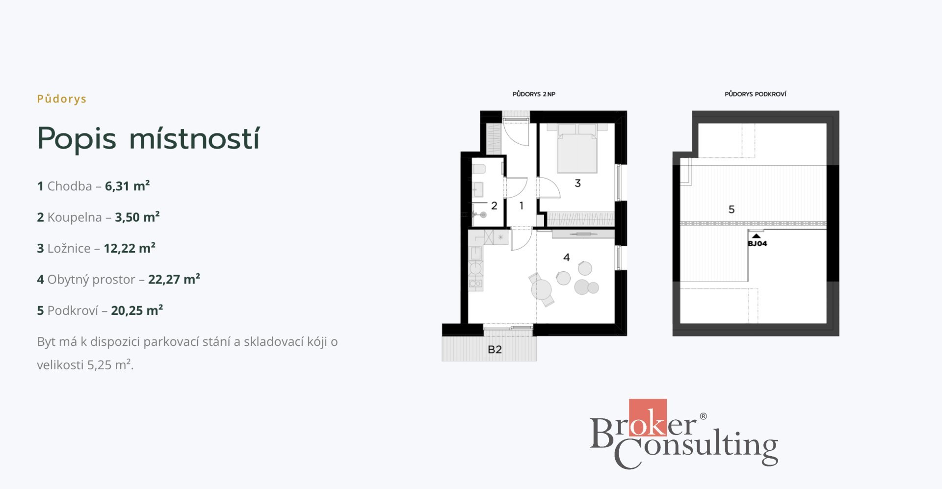 Bytová jednotka s označením BJ04 se nachází ve 2. nadzemním podlaží a nabízí praktickou dispozici 2+kk o celkové výměře 67 m². Interiér je navržen tak, aby poskytoval dostatek světla a pocit vzdušnosti. K jednotce náleží balkon o výměře 4,26 m², který je ideálním místem pro relaxaci s výhledem do krajiny. Součástí prodeje je také vyhrazené parkovací místo a skladovací kóje o velikosti 5,25 m² pro uložení sezónního vybavení, jako jsou lyže či kola.