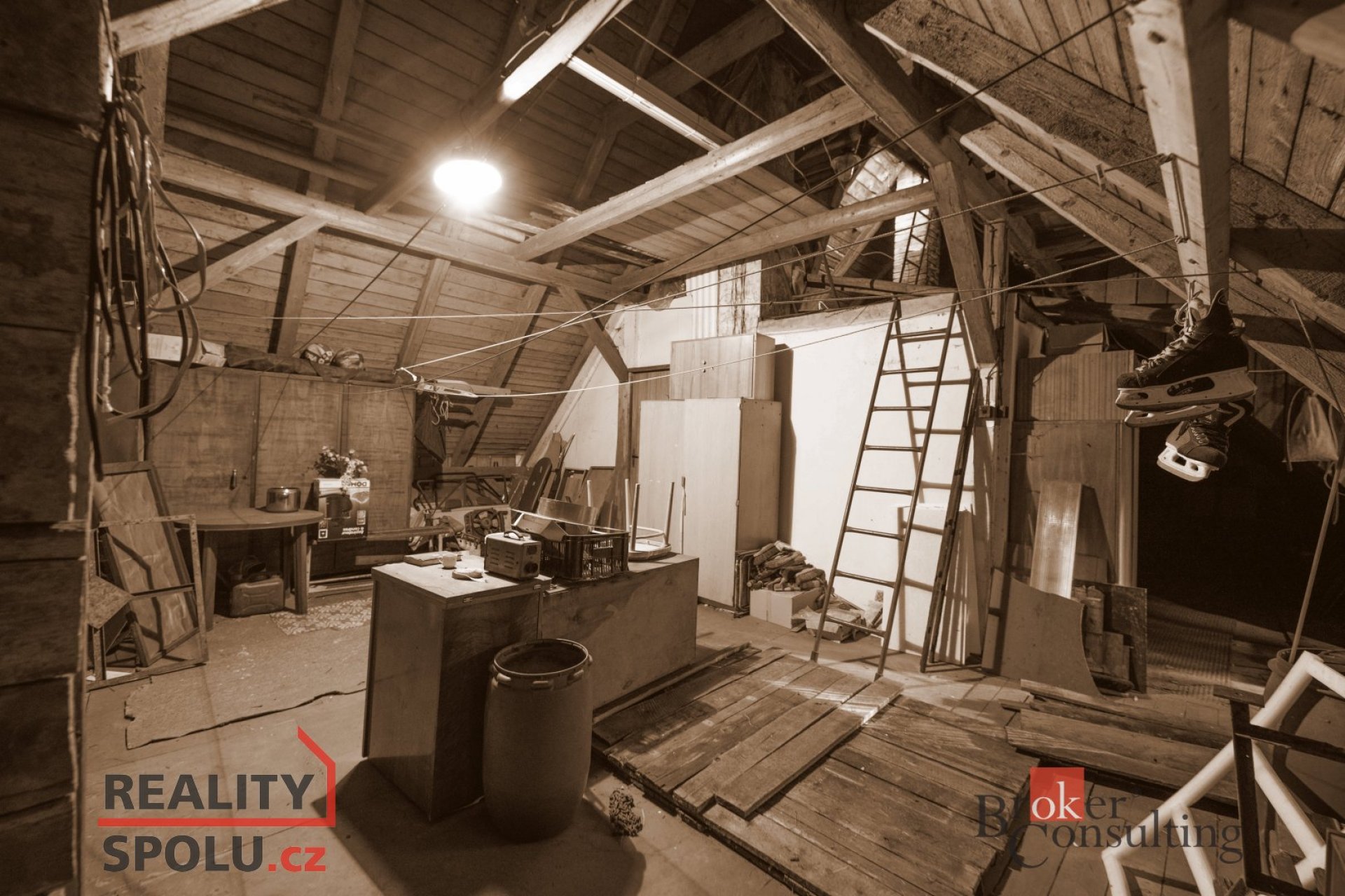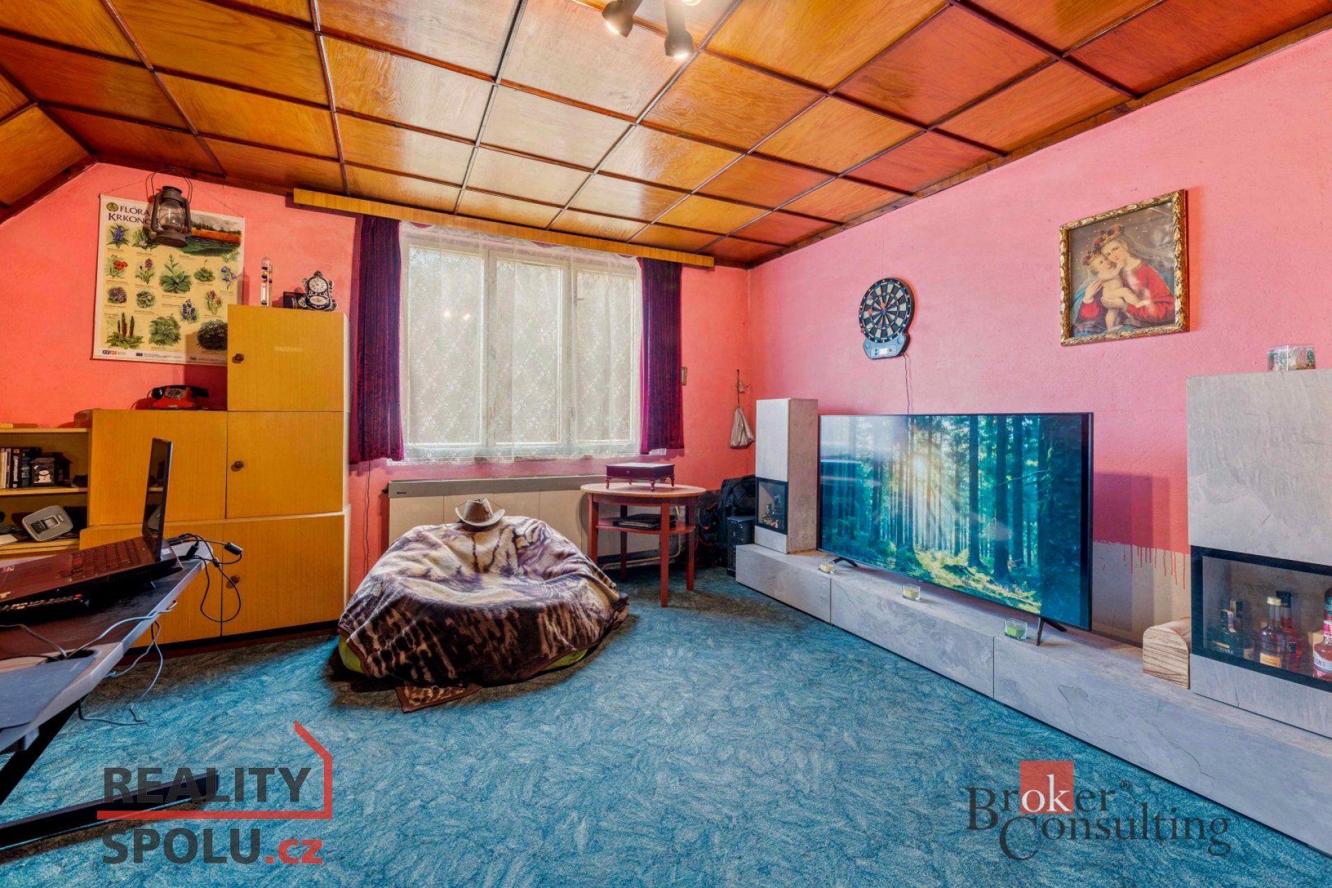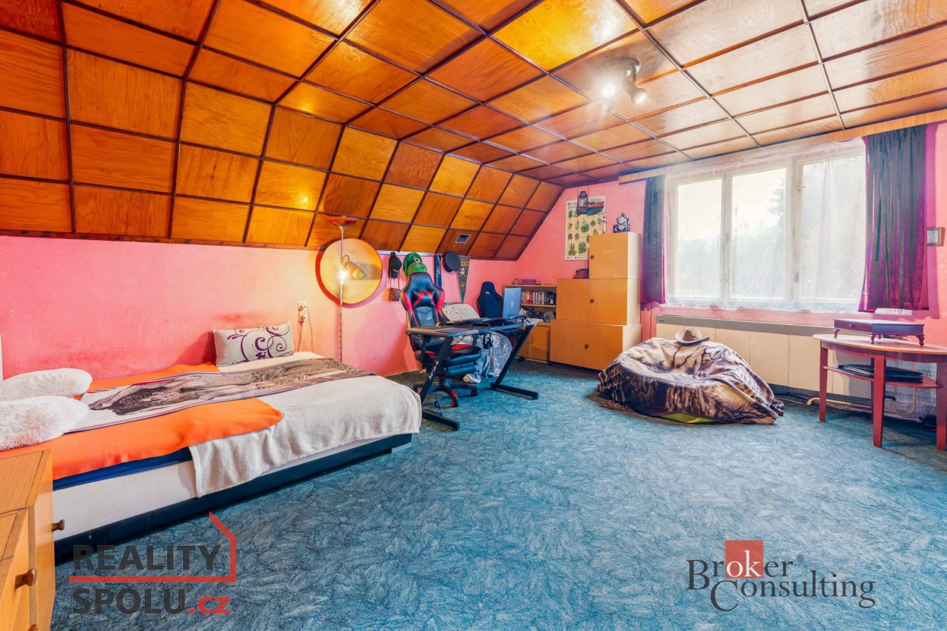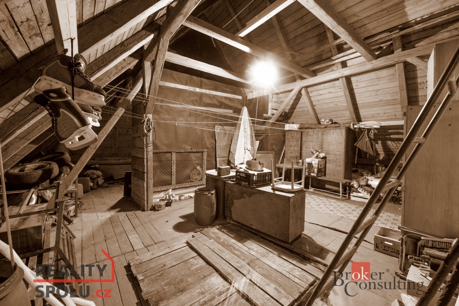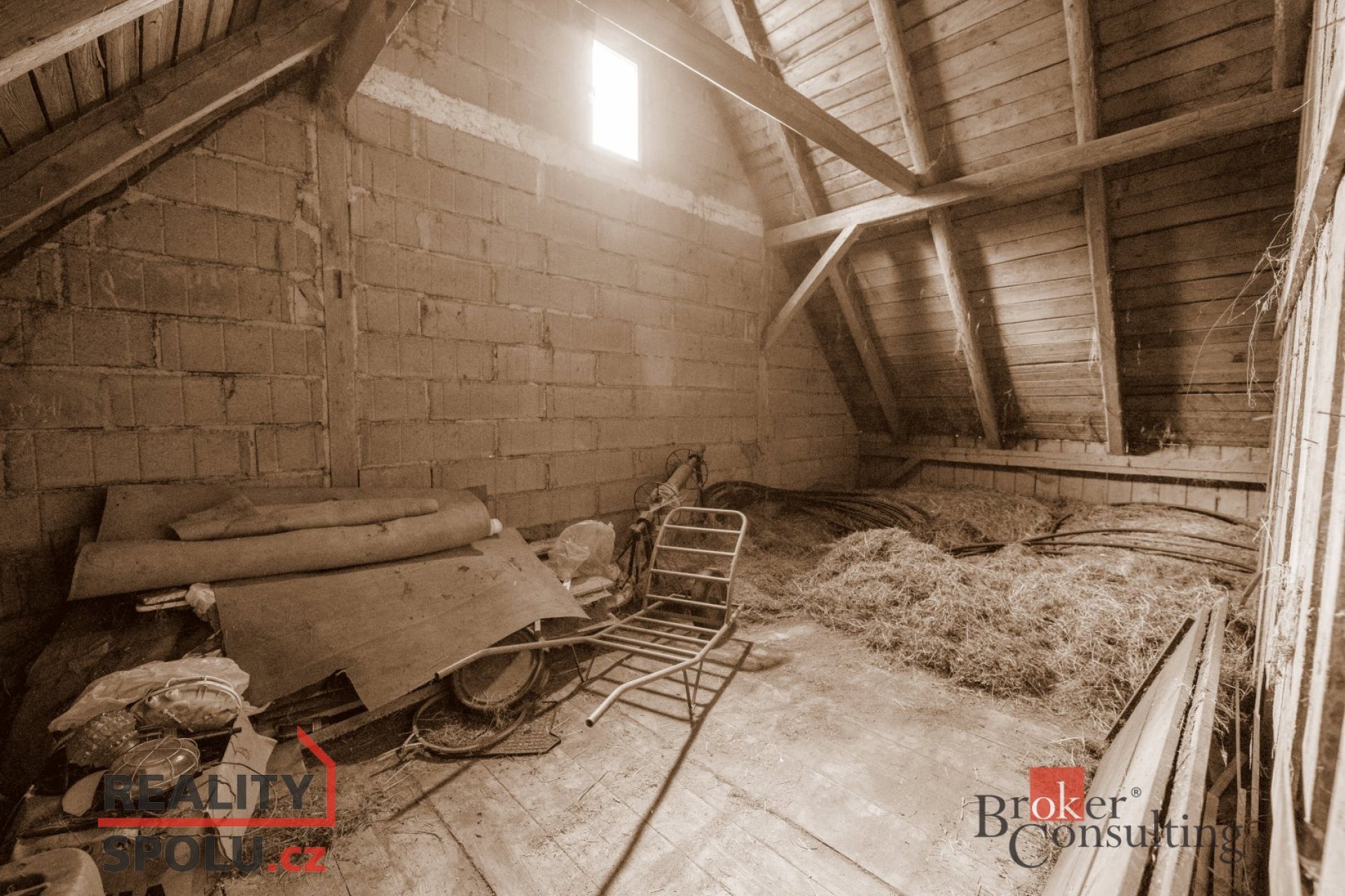 V patře se nachází velký a malý pokoj, vstupní chodba se schodištěm a dále půdní prostory. V domě se částečně bydlí a vše je funkční.