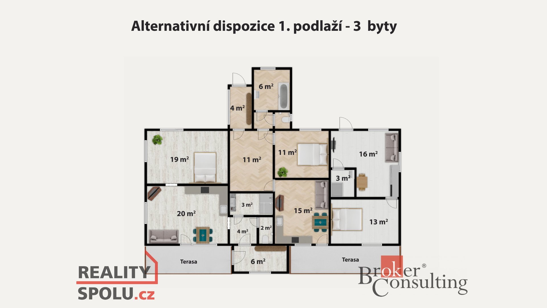 Na fotkách jsou 2 návrhy možného budoucího obývacího pokoje s kuchyňským koutem. Dále jsou na konci fotodokumentace nákresy stávajícího i možného budoucího dispozičního uspořádání s 9 byty. Návrh byl v obecné rovině z hlediska potenciální výstavby více bytů konzultován se stavebním odborem a územním plánováním v Trutnově.