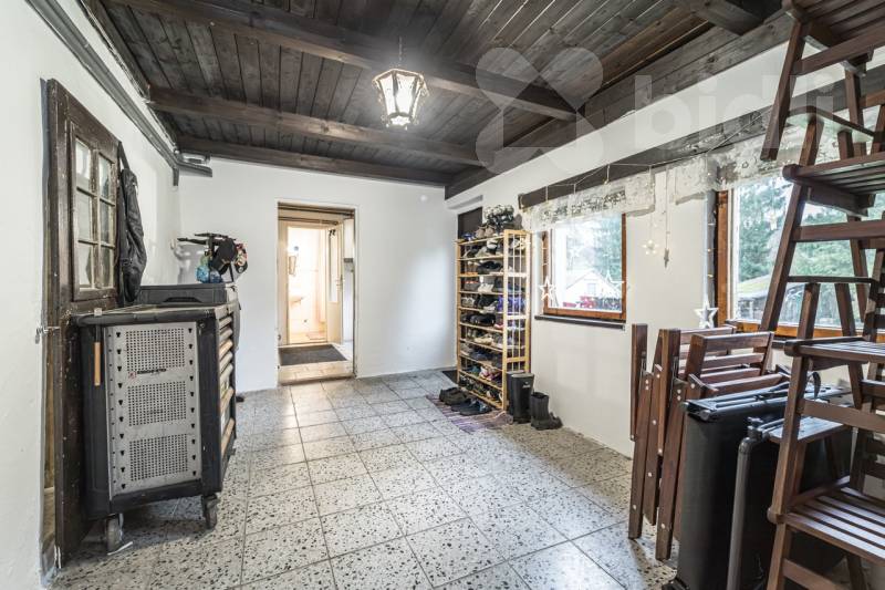 Chalupa je ve velmi dobrém technickém stavu a je patrné, že se o ni majitelé dlouhodobě starali. V prvním nadzemním podlaží se nachází obývací pokoj, samostatná kuchyně, koupelna, garáž a řada menších místností, které lze využít jako sklad, technické zázemí nebo dílnu. Přízemí působí prakticky a nabízí množství úložných prostor. Z obývacího pokoje je příjemný výhled do okolní zeleně.