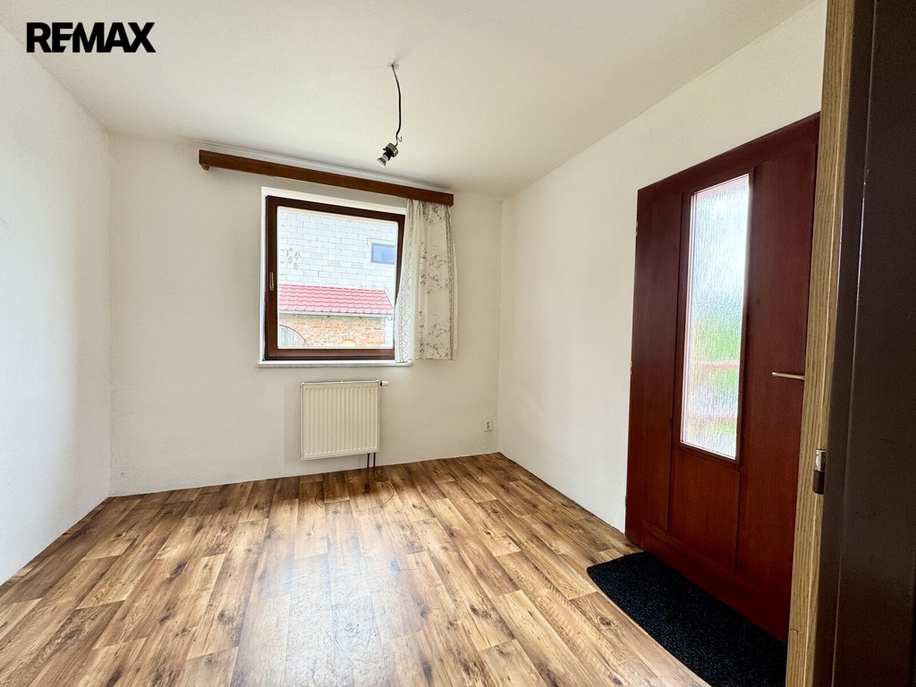 Rodinný dům je z cihel, zateplený 10 cm polystyrenem a má Euro okna. Vstup po schodišti do místnosti, která může být vstupní místností nebo pokojem, pokud by se změnil způsob vstupu do domu chodbou. Dlouhou chodbou jsou vstupy na WC, do koupelny s vanou a sprchovým koutem, pokoje, který je nutné ještě dobudovat (podlaha), ložnice, obývacího pokoje, kuchyně. Z kuchyně je vstup do spíže. V domě je technická místnost s východem na zahradu. V technické místnosti jsou kamna na TP, plynový kotel a nádrže na vodu. Podlahy v domě jsou dlažba a plovoucí podlahy v pokojích. V předsíni výklenek na vestavěné skříně. Dispozičně 3+1 a v případě změny vstupních dveří 4+1. K domu přiléhá garáž s elektrickými vraty a výminek 1+kk, který není zateplený a má plastová i dřevěná okna.