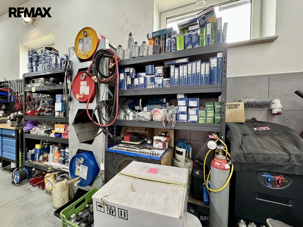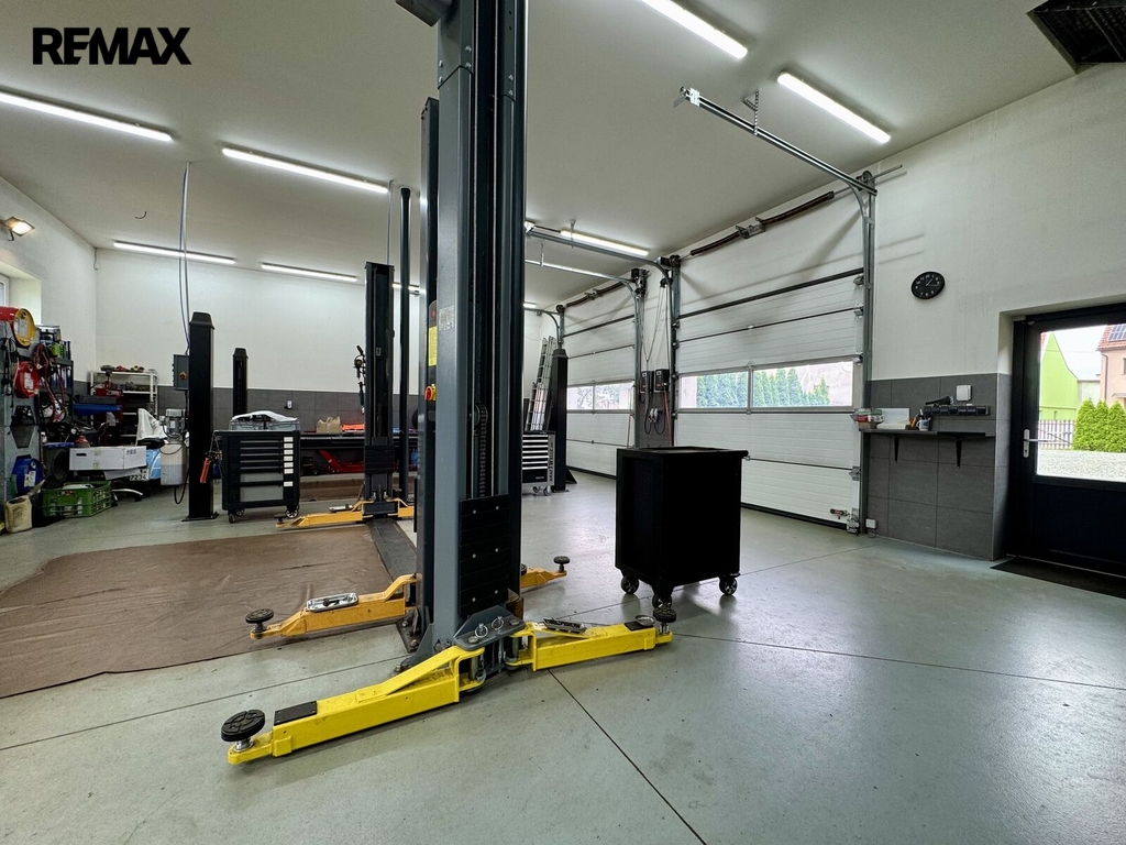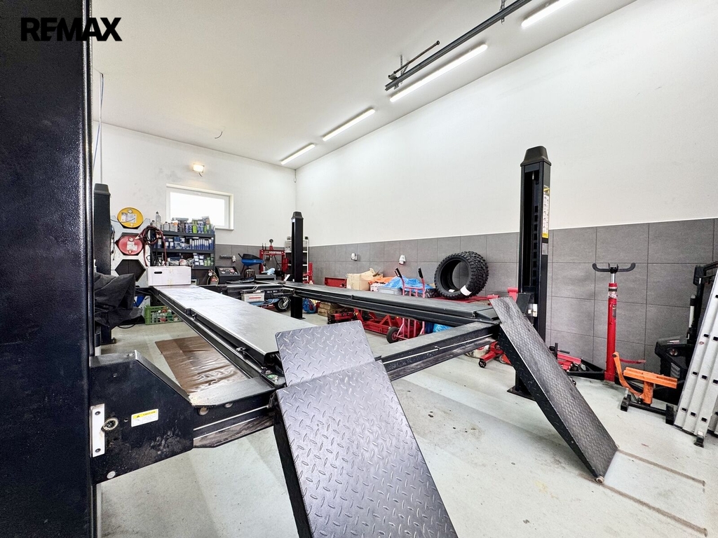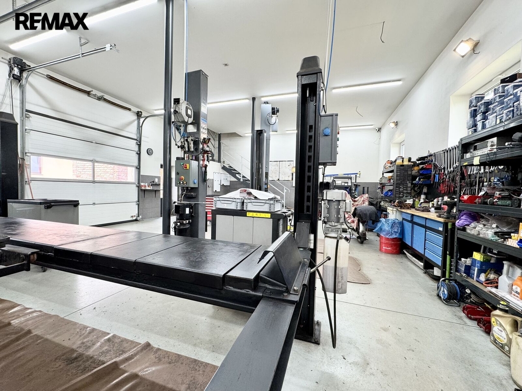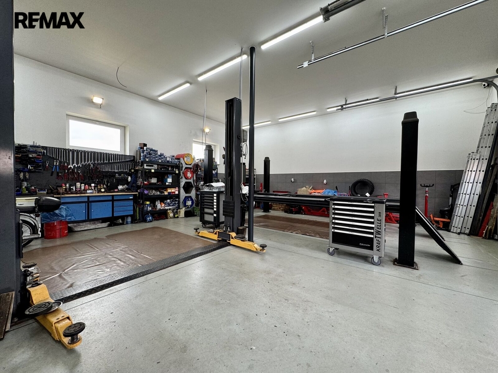 Na pozemek je vjezd elektrickými vraty na větší parkovací plochu, kde je vjezd přímo k autodílně. Autodílna je dvoupodlažní, vjezd dvěma elektrickými vraty a vstup dveřmi. V přízemí, které má 100 m2, je hala, která sloužila, jako autodílna. K dispozici WC s umyvadlem. Ve 2.NP je sklad, kde je možné vybudovat zázemí. Stavba je z tvárnic, střecha zateplená foukanou izolací. K dodělání strop a zateplení s fasádou. Dílna je vytápěna z kotelny domu. Na bočních stěnách dílny jsou fotovoltaické panely a elektřinu je možné využít i v domě.