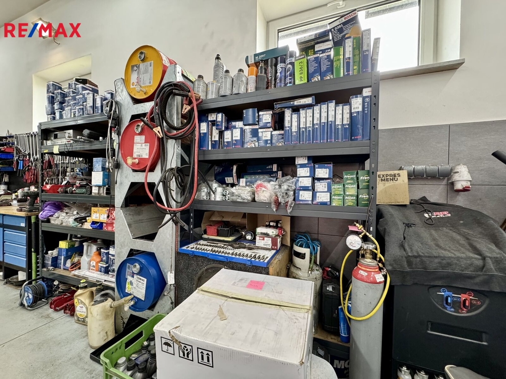 Na pozemek je vjezd elektrickými vraty na větší parkovací plochu, kde je vjezd přímo k autodílně. Autodílna je dvoupodlažní, vjezd dvěma elektrickými vraty a vstup dveřmi. V přízemí, které má 100 m2, je plně vybavená dílna se 3 zvedáky a dalšími přístroji včetně náhradních autodílů. K dispozici WC s umyvadlem. Ve 2.NP je sklad, kde je možné vybudovat zázemí. Stavba je z tvárnic, střecha zateplená foukanou izolací. K dodělání strop a zateplení s fasádou. Dílna je vytápěna z kotelny domu. Na bočních stěnách dílny jsou fotovoltaické panely a elektřinu je možné využít i v domě.
