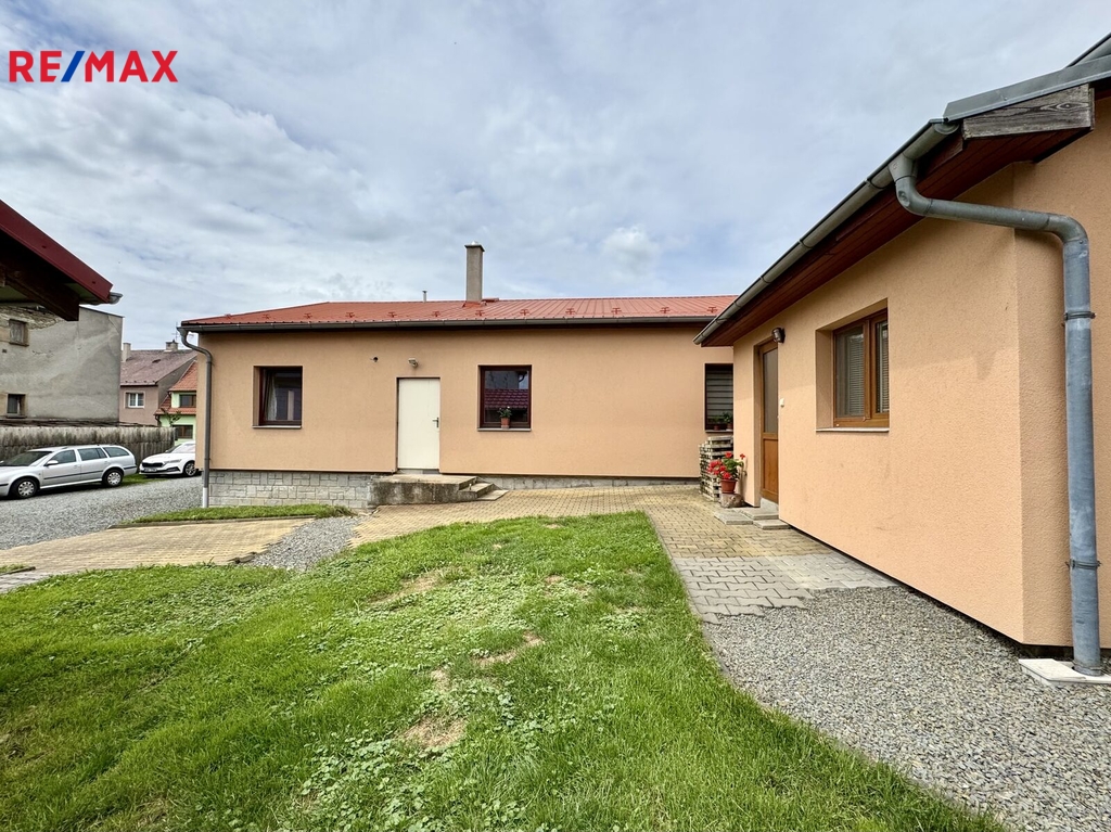 Rodinný dům je z cihel, zateplený 10 cm polystyrenem a má Euro okna. Vstup po schodišti do místnosti, která může být vstupní místností nebo pokojem, pokud by se změnil způsob vstupu do domu chodbou. Dlouhou chodbou jsou vstupy na WC, do koupelny s vanou a sprchovým koutem, pokoje, který je nutné ještě dobudovat (podlaha), ložnice, obývacího pokoje, kuchyně. Z kuchyně je vstup do spíže. V domě je technická místnost s východem na zahradu. V technické místnosti jsou kamna na TP, plynový kotel a nádrže na vodu. Podlahy v domě jsou dlažba a plovoucí podlahy v pokojích. V předsíni výklenek na vestavěné skříně. Dispozičně 3+1 a v případě změny vstupních dveří 4+1. K domu přiléhá garáž s elektrickými vraty a výminek 1+kk, který není zateplený a má plastová i dřevěná okna.