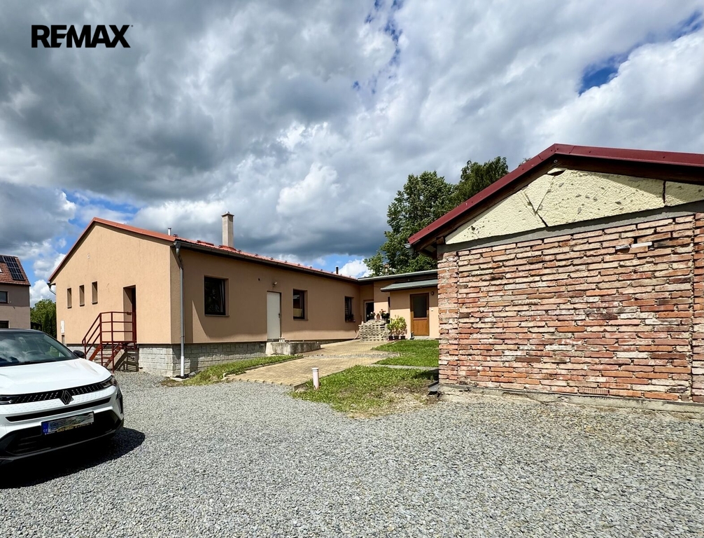 Vše pro provoz: Plechový sklad na nářadí, garáž s elektrickými vraty a velká parkovací plocha přímo na pozemku s vlastním vjezdem.