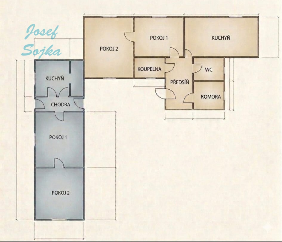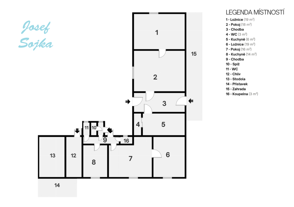 Dispozice druhé bytové jednotky: ložnice 19m2, pokoj 16m2, kuchyně 14m2, koupelna 3m2, samostatné WC a spíž 8 m2.