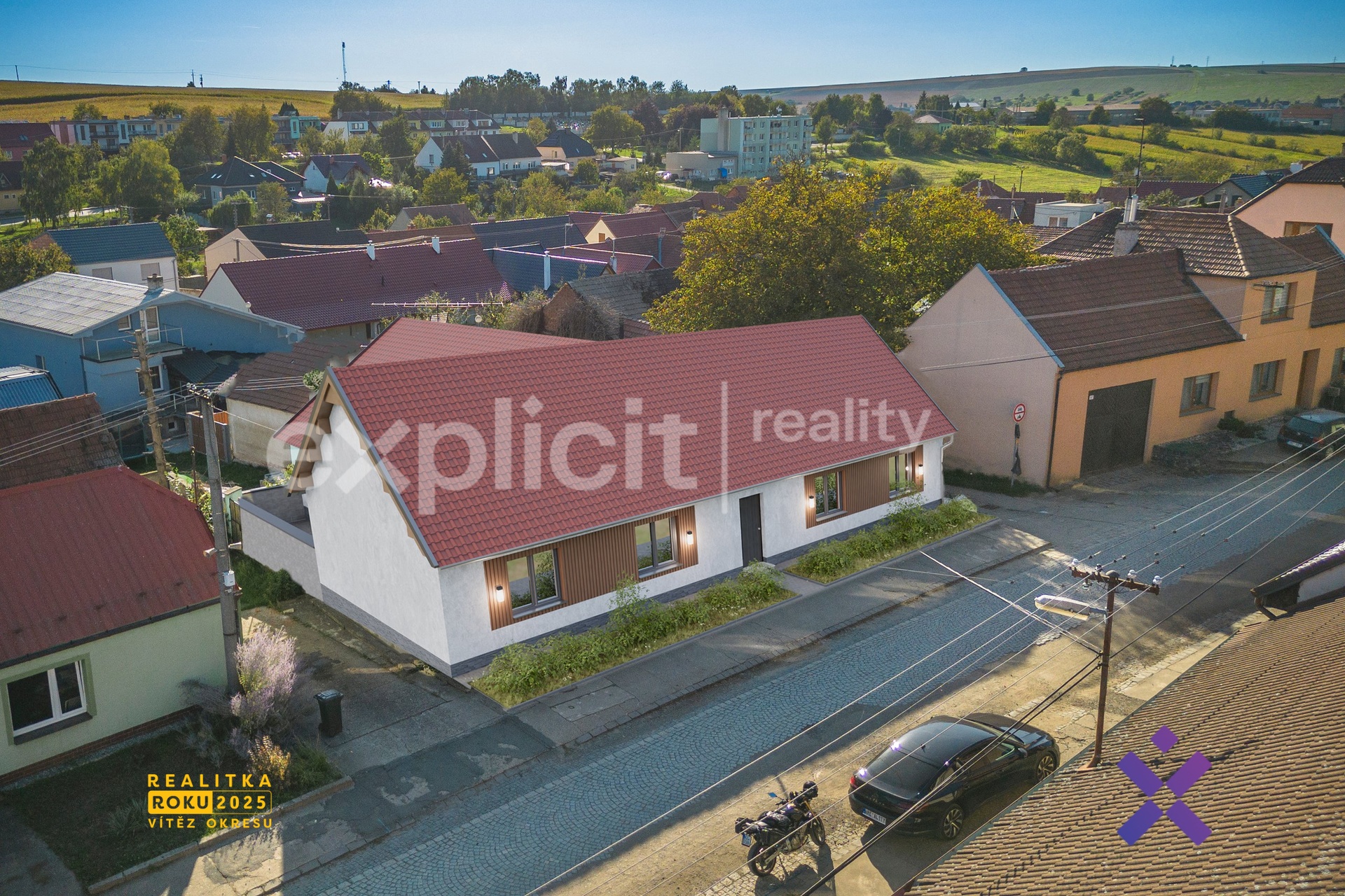 - pozemek 459 m² – kompaktní, ale praktický, se vstupem i z boční části na zahradu a do garáže