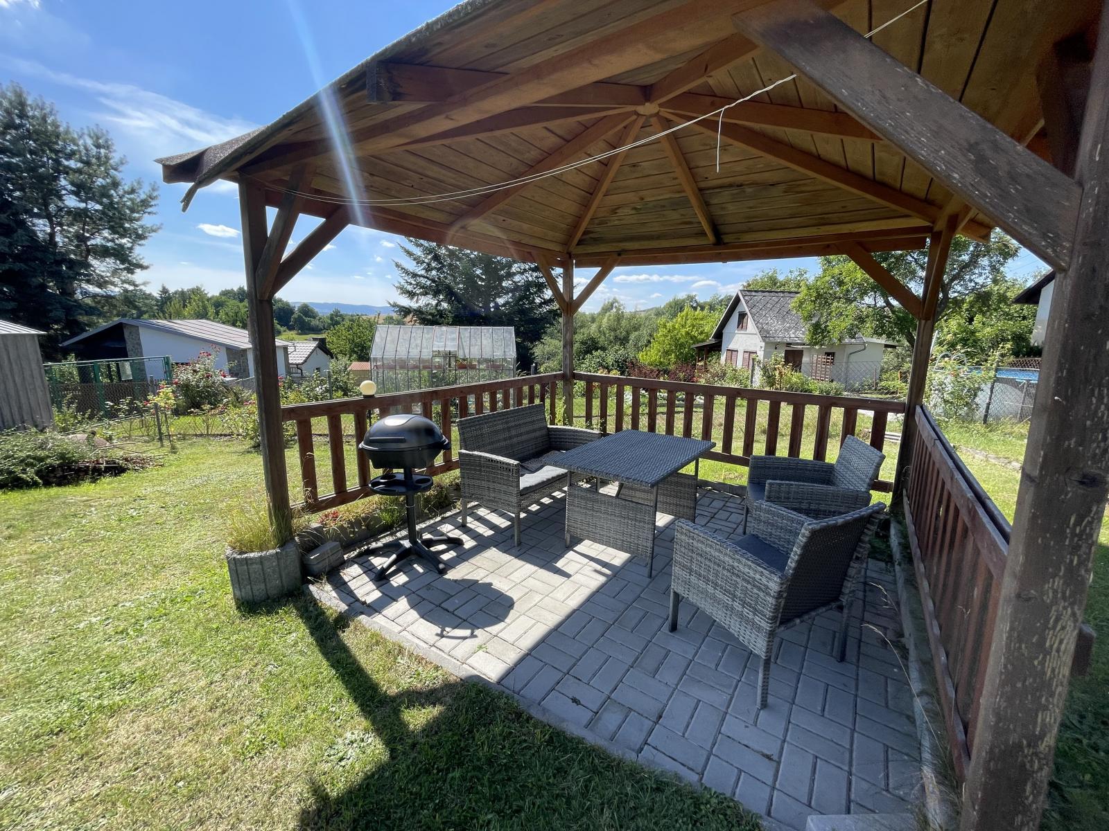 Vlastní pozemek, zahrada se zahradním altánem a malé plechové stavby na nářadí, má krásnou polohu.