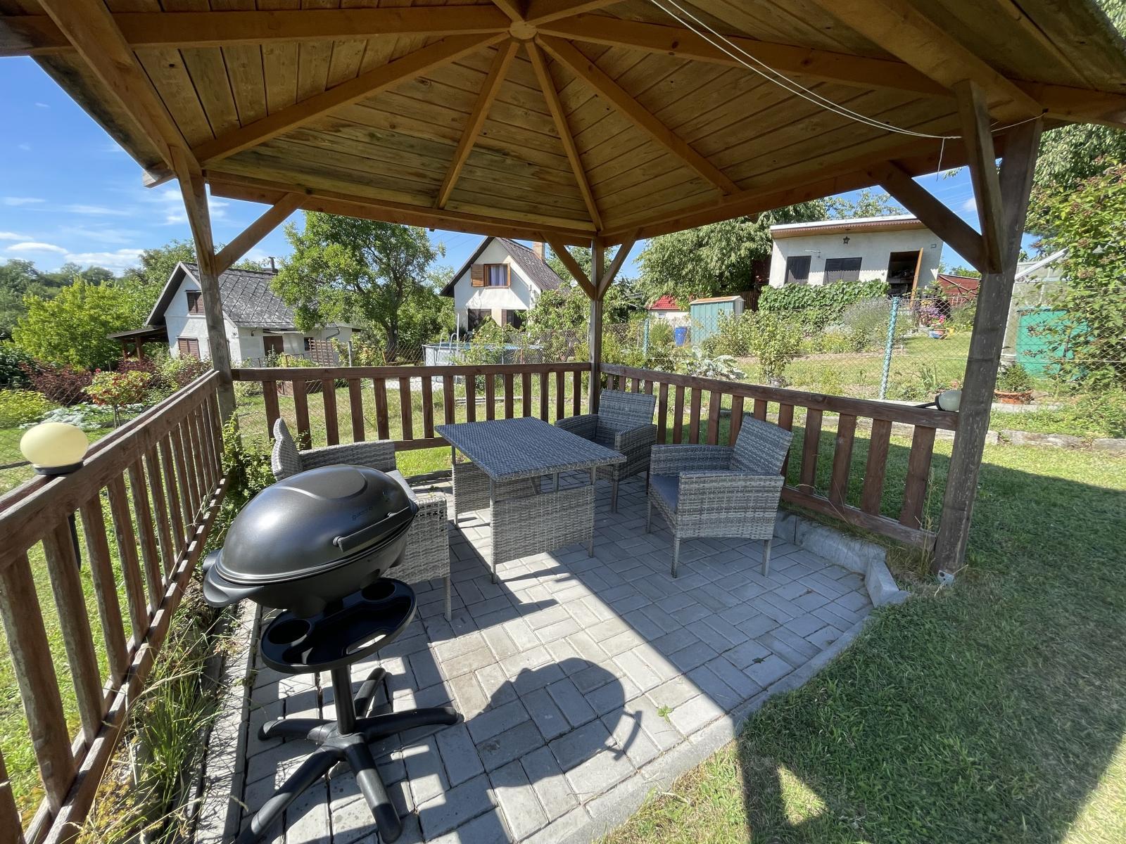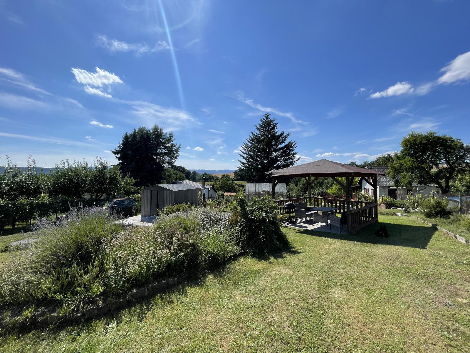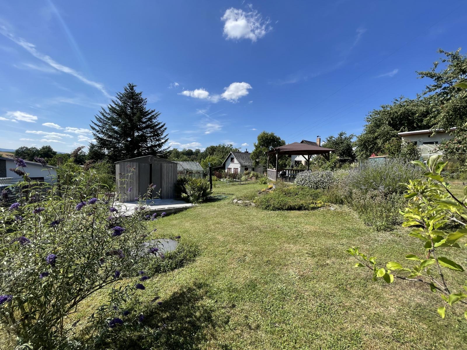 Vlastní pozemek, zahrada se zahradním altánem a malé plechové stavby na nářadí, má krásnou polohu.