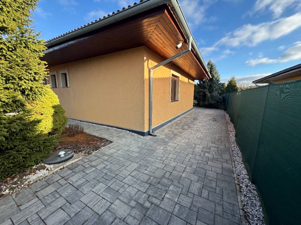 Dům je řešen jako komfortní bungalov s prostorným obývacím pokojem, krbem, kuchyňským koutem a třemi samostatnými pokoji. Podlahové vytápění v domě zajišťuje maximální pohodlí, přičemž energetická třída A garantuje nízké provozní náklady.