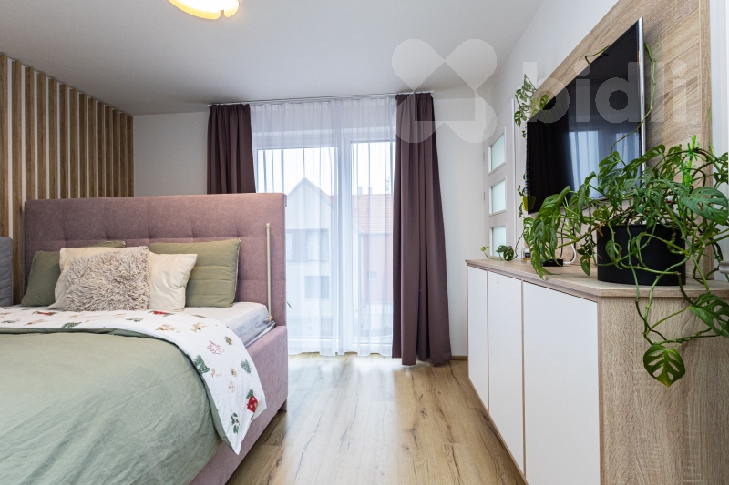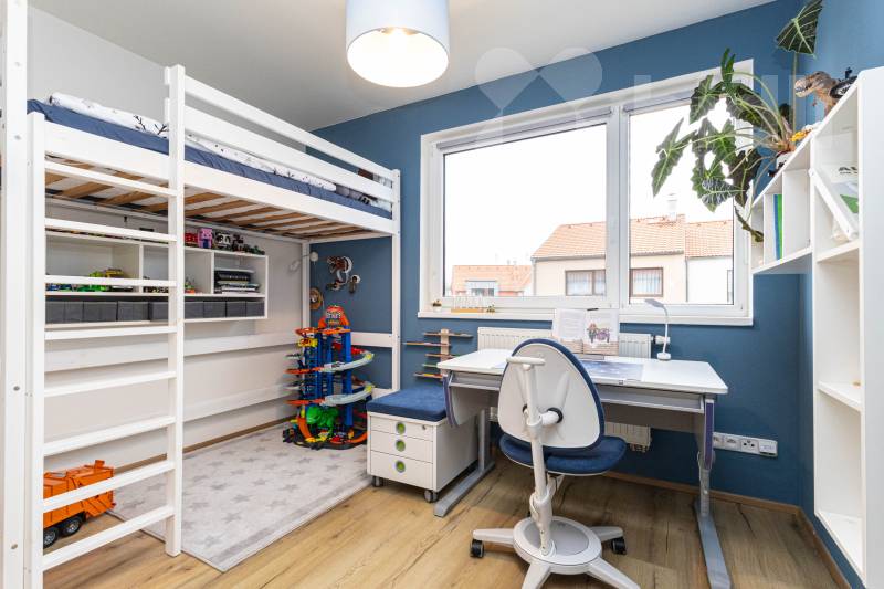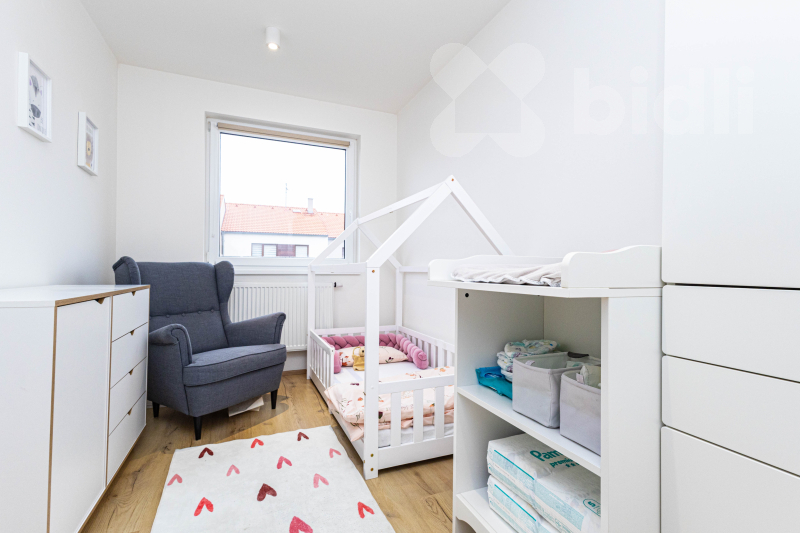 V patře domu o ploše 51,82 m² se nachází hlavní ložnice s vlastní koupelnou se sprchovým koutem, dále druhá koupelna s vanou, dva dětské pokoje a samostatná šatna. Interiér domu je vybaven plovoucími podlahami a keramickou dlažbou, které podtrhují moderní charakter nemovitosti.