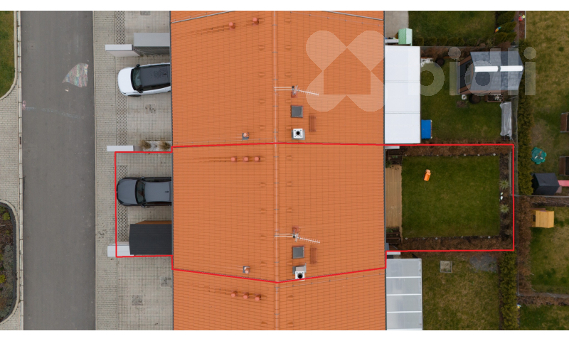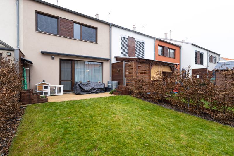 K domu náleží terasa o velikosti 4,86 m² a zahrada o výměře 59 m², dále parkovací stání přímo před domem a nový zahradní domek, který nabízí praktický úložný prostor pro sekačku, motorku či jízdní kola.