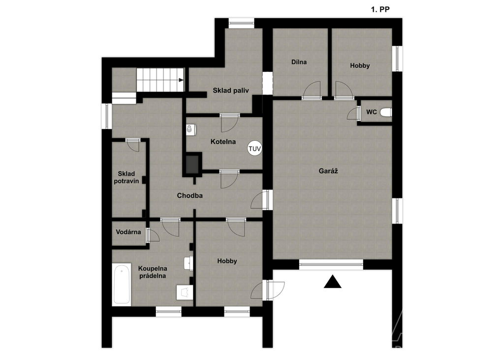Součástí domu je prostorná garáž o velikosti 28 m², ze které lze vstoupit přímo do interiéru, což zvyšuje komfort zejména v zimním období. Velkým bonusem je také rozlehlá půda v celé šířce střechy, kterou lze upravit na další obytné místnosti nebo ateliér.