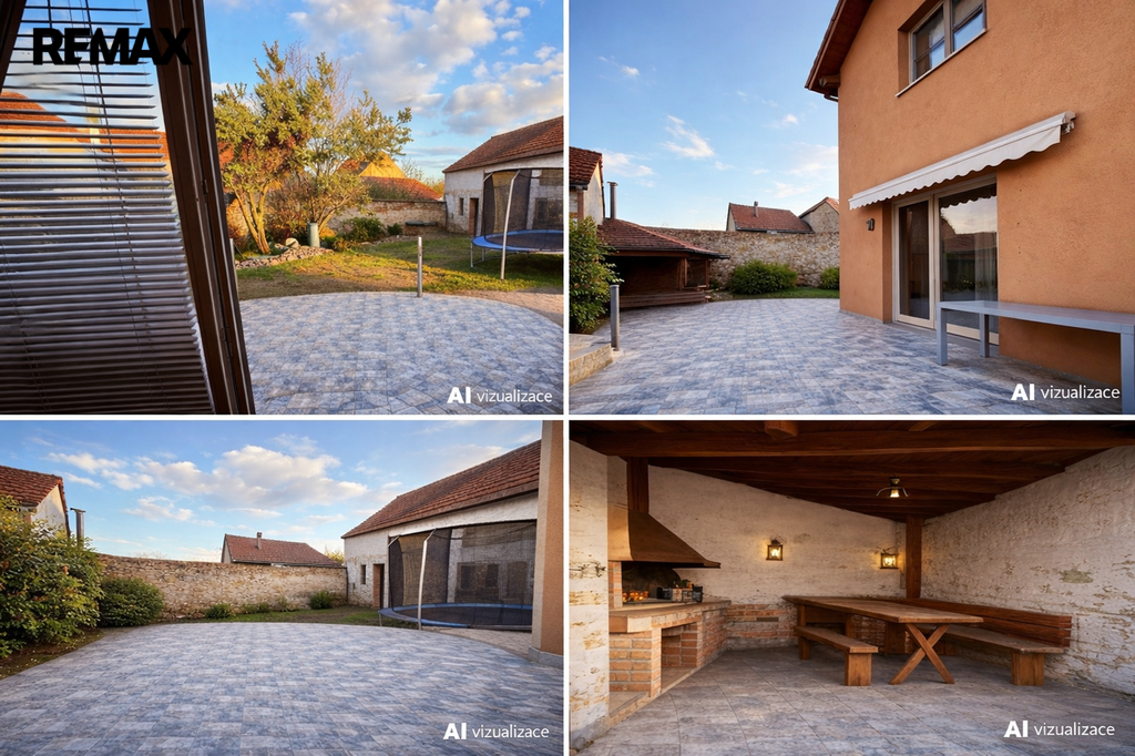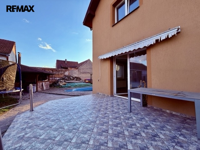 K bytu náleží terasa. Po dohodě je možné využívat také zahradní posezení pod přístřeškem a bazén. Zahrada je sdílená s majiteli horního bytu.