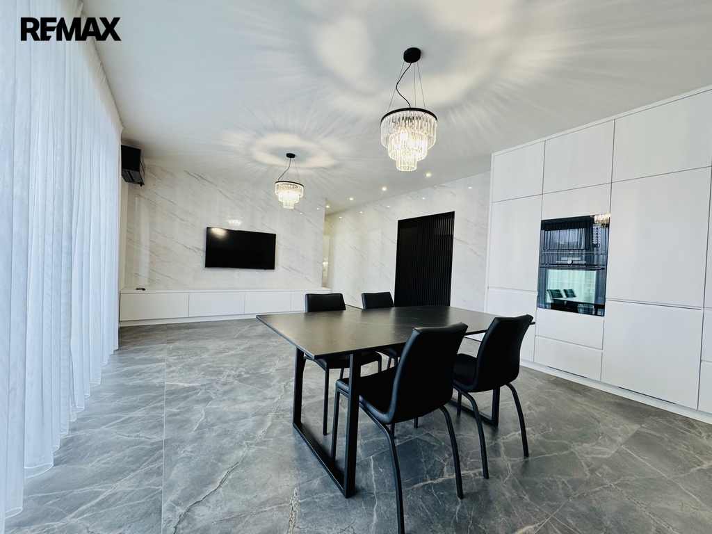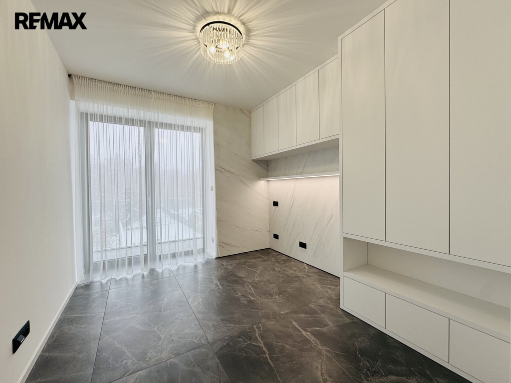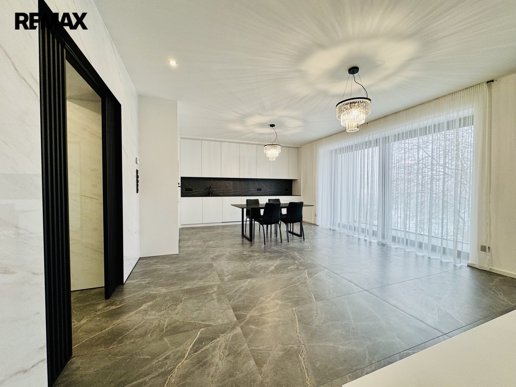 Dominantou bytu je velký elegantní obývací prostor s přímým vstupem na lodžii, který plynule navazuje na plně vybavenou kuchyni s velkým jídelním stolem. Kuchyň je osazena všemi moderními spotřebiči, včetně myčky nádobí, indukční varné desky, trouby, lednice s mrazákem a kvalitního odsavače par, led osvětlením. Dispozičně byt dále nabízí hlavní ložnici s vlastní koupelnou a toaletou, dětský pokoj/pracovnu, dětský pokoj/pracovnu, předsíň a druhou koupelnu s toaletou.