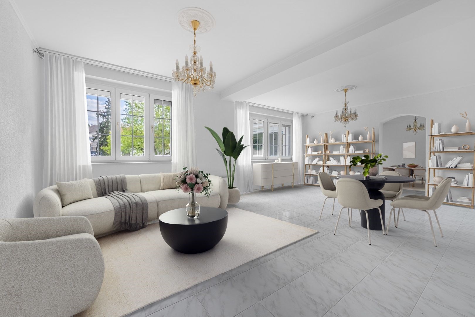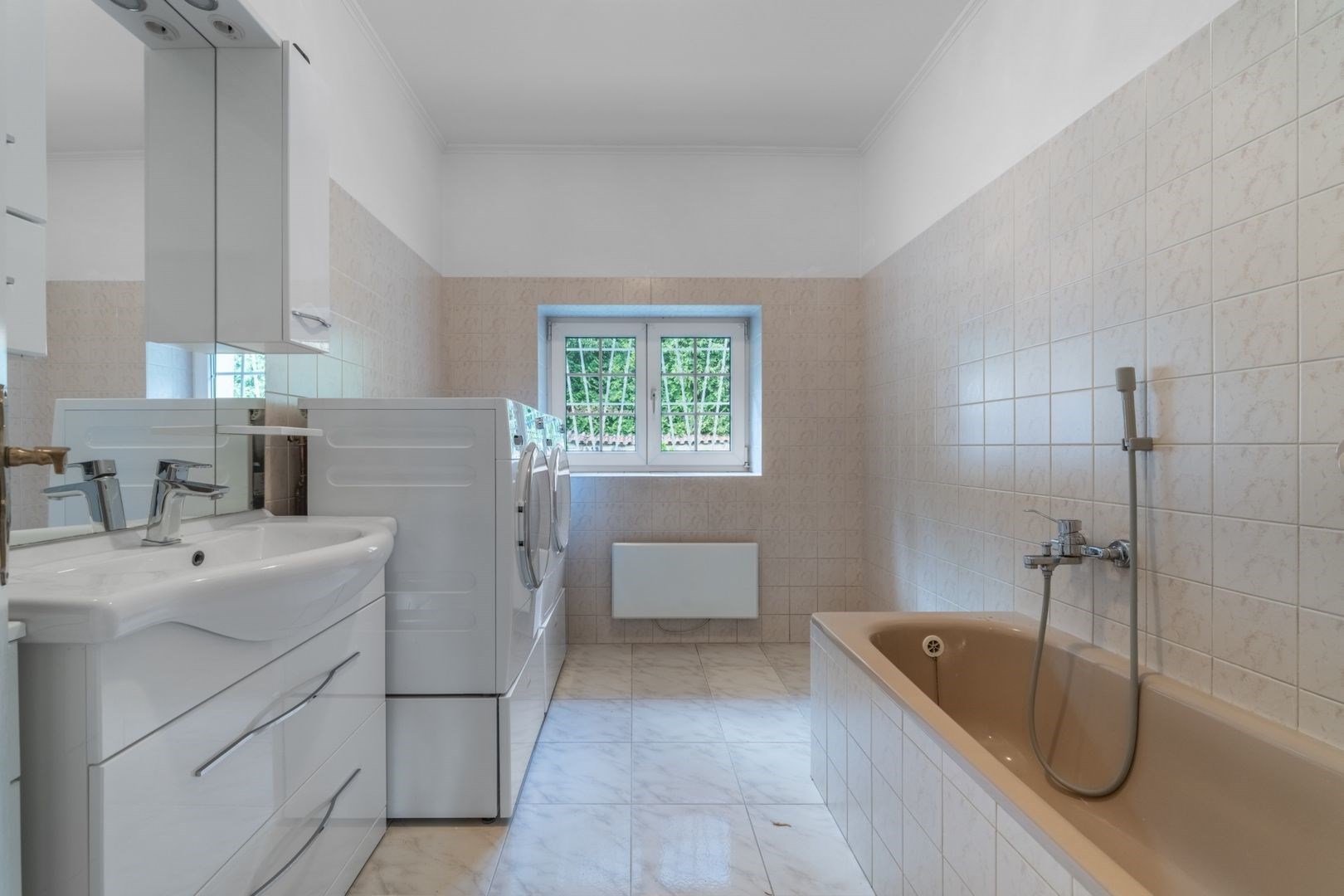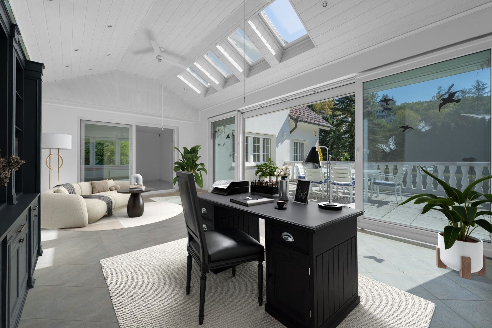 Přízemí: prostorný obývací pokoj, jídelna, kuchyň, spíž, zimní zahrada s přímým vstupem na terasu, koupelna a technická místnost. Podlahy tvoří praktická dlažba v šedobílém provedení.