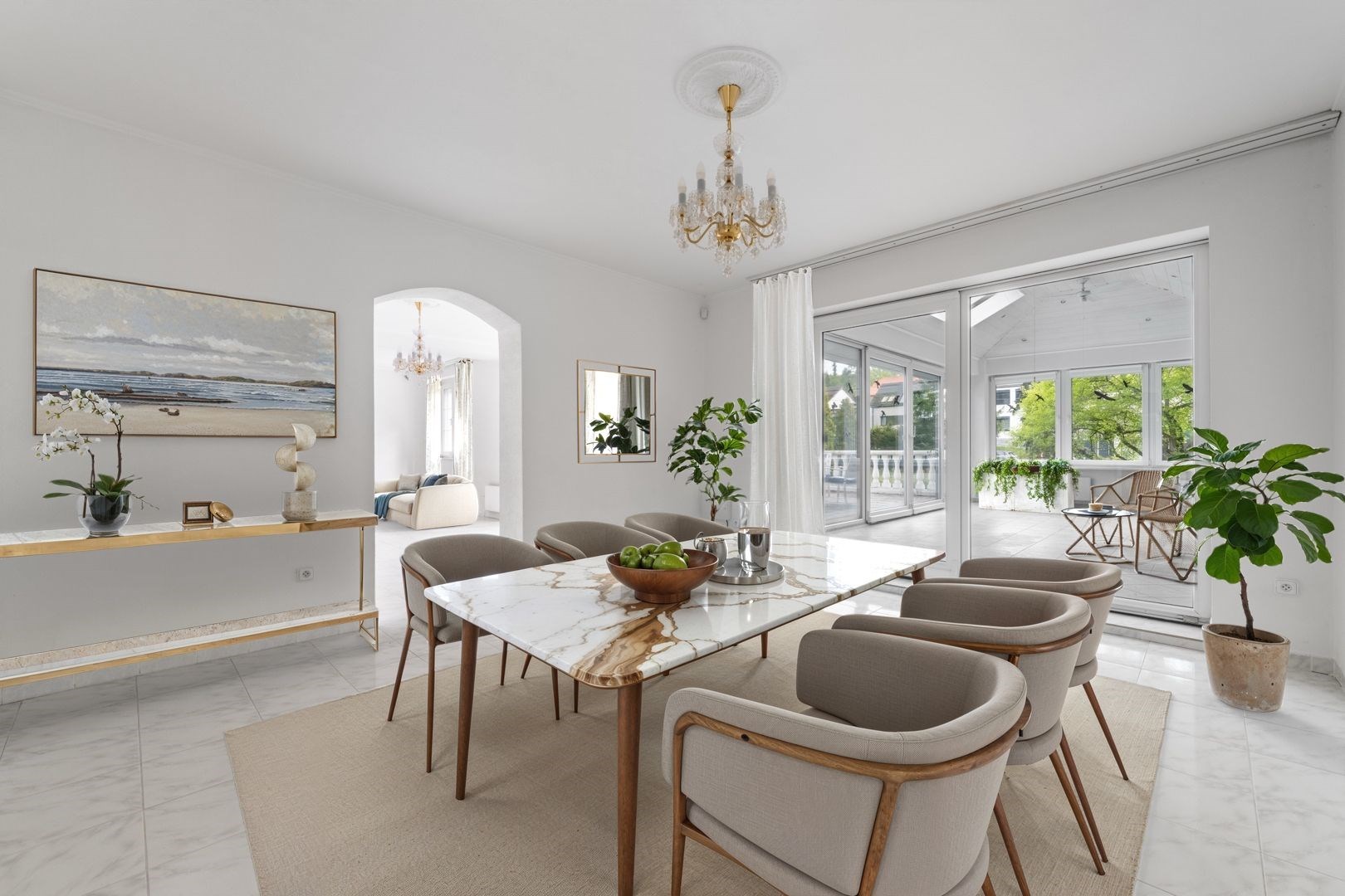Kuchyň je vybavena vestavnými spotřebiči (trouba, sklokeramická deska, digestoř, myčka). Koupelny obsahují vanu, sprchový kout a dvě umyvadla. Zimní zahrada příjemně propojuje interiér se zahradou a rozšiřuje obytný prostor.