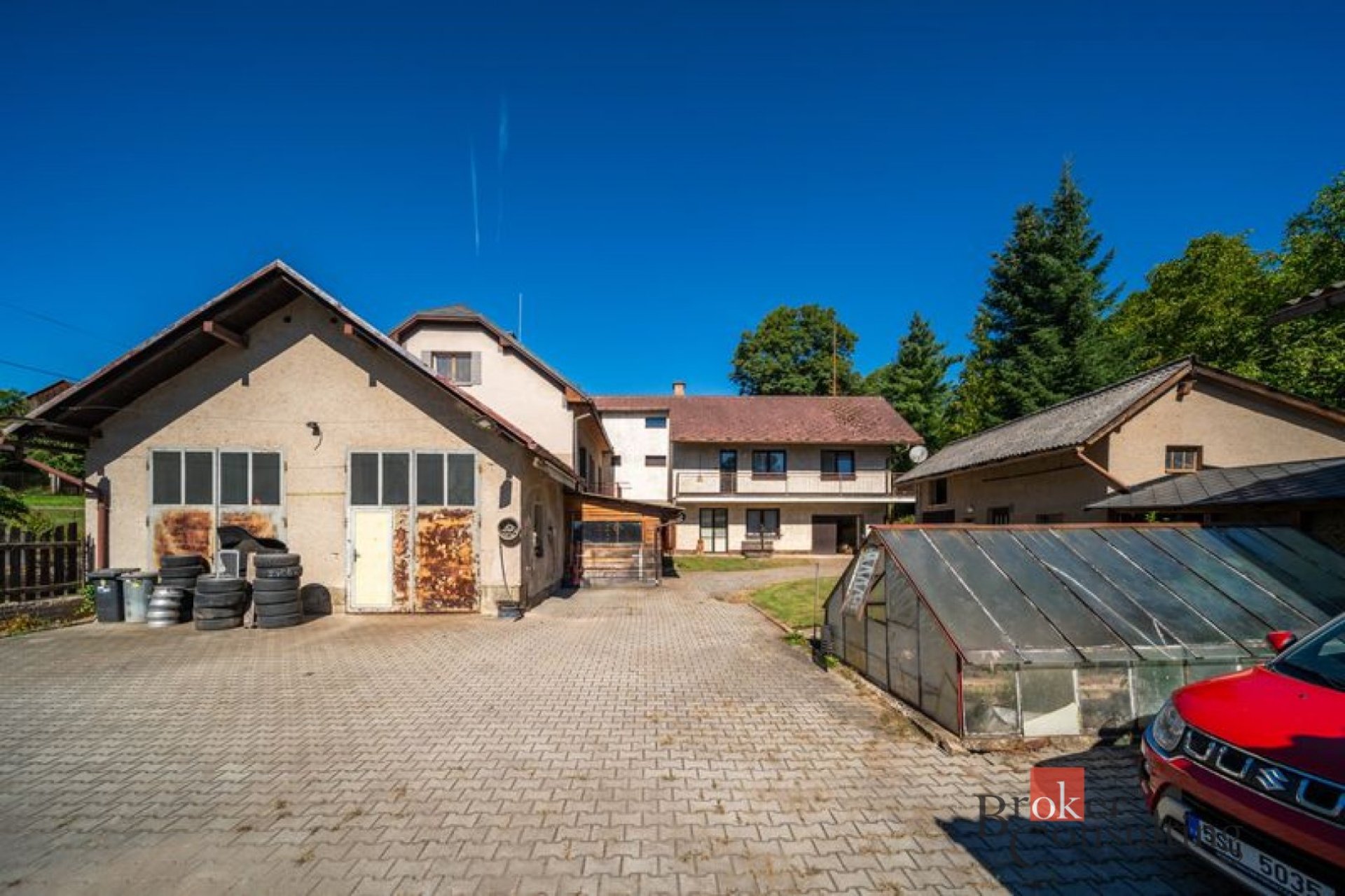 Dům disponuje obytnou částí v přízemí, která se skládá ze vstupní chodby, koupelny, oddělenou toaletou, kuchyňským koutem s jídelnou, obývacím pokojem a dvěma pokoji. V podkroví je zřízen také jeden pokoj, zbytek podkroví je neobyvatelný. Dále je dům plně podsklepen a slouží z části jako technické zázemí pro vytápění, velkou dílnou a v neposlední řadě se dá projít do velké dvoj-garáže, která původně sloužila jako pneuservis. K domu náleží nádvoří s pergolou, dřevníky, další garáží a skleníkem.