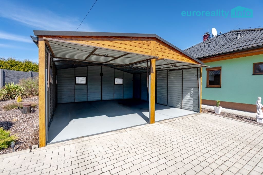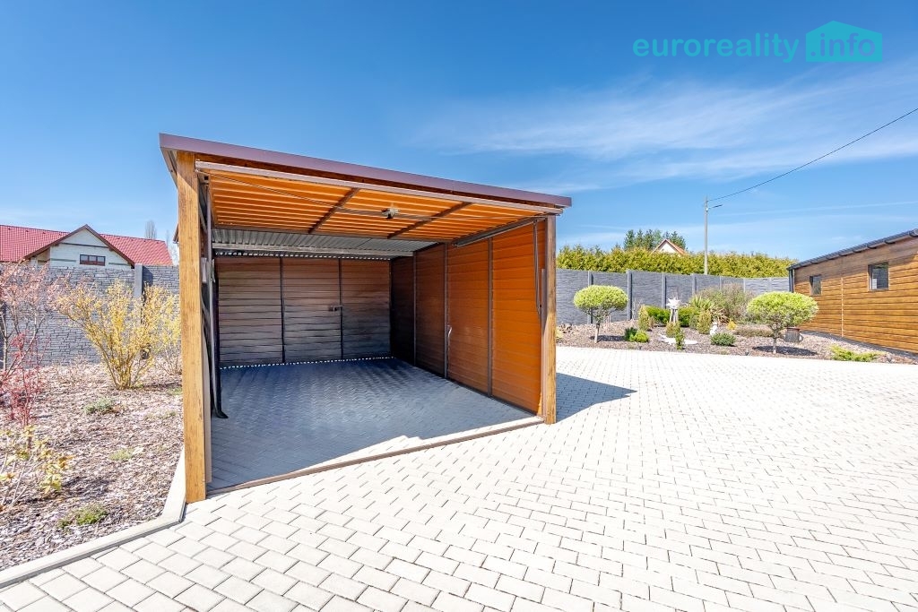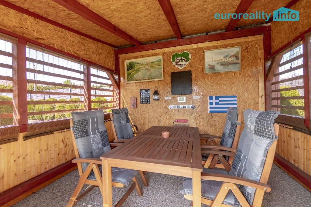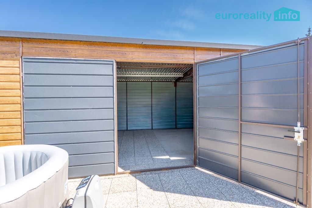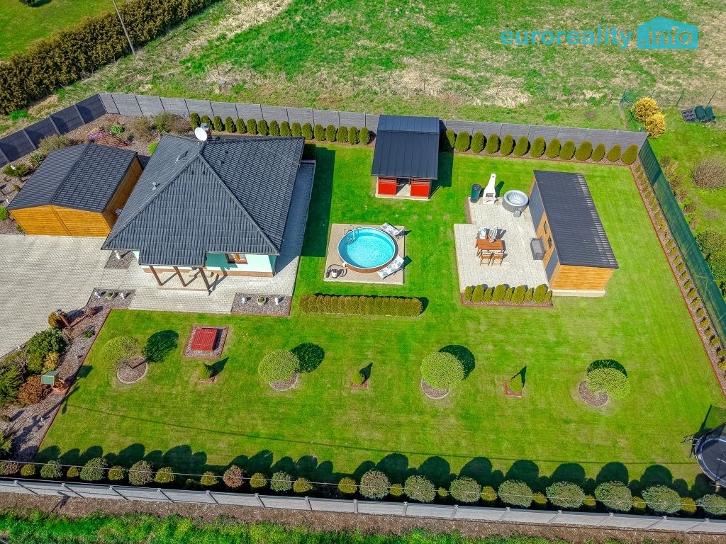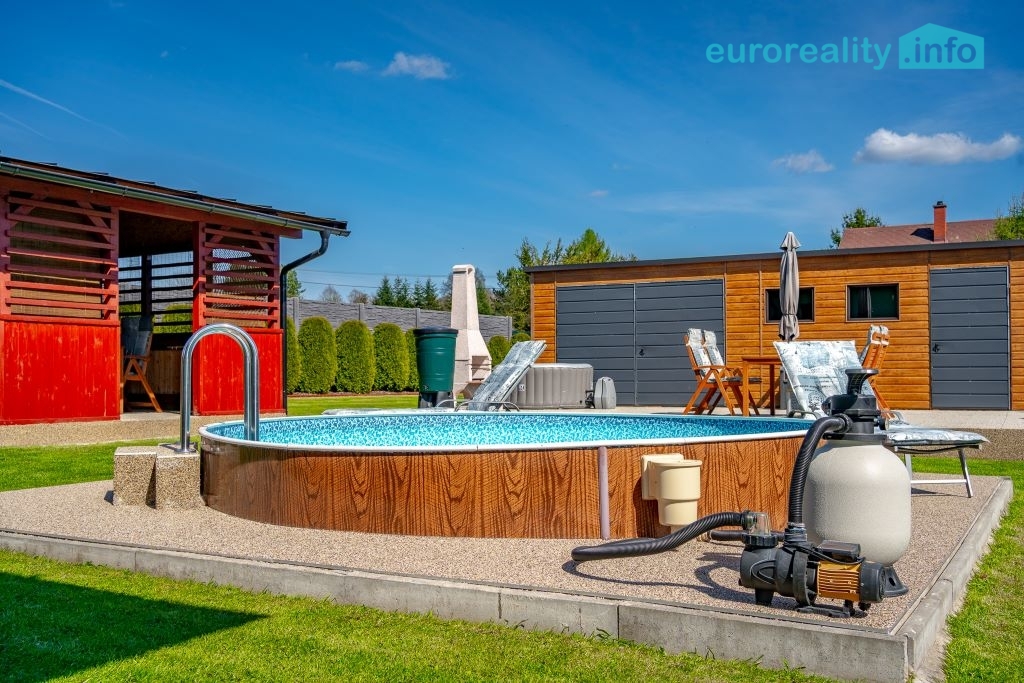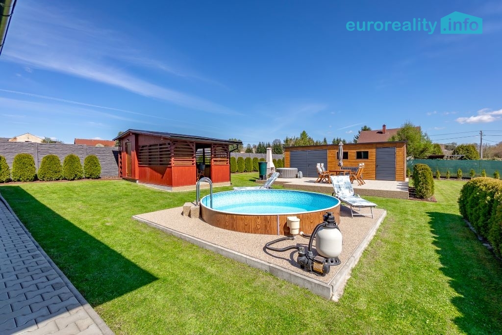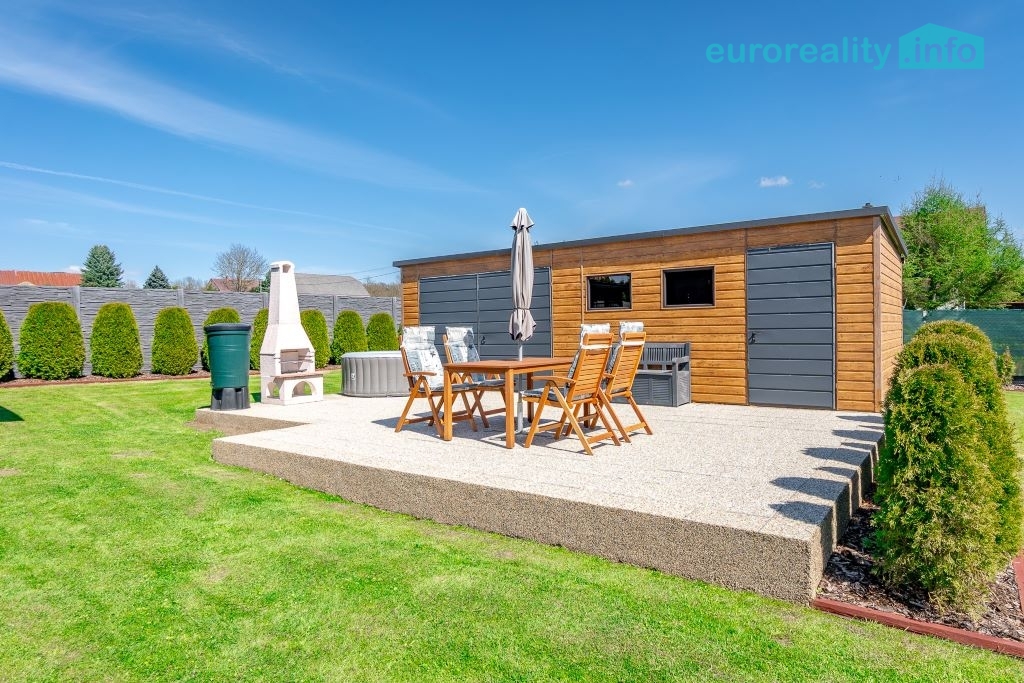 Pro odpočinek a volnočasové aktivity je k dispozici krytá pergola o velikosti 12 m² s nerezovou plynovou kuchyňkou, zapuštěný bazén, elektrická vířivka, trampolína a betonový venkovní gril. Tento prostor je ideální pro rodinná setkání, grilování i relaxaci v soukromí.
