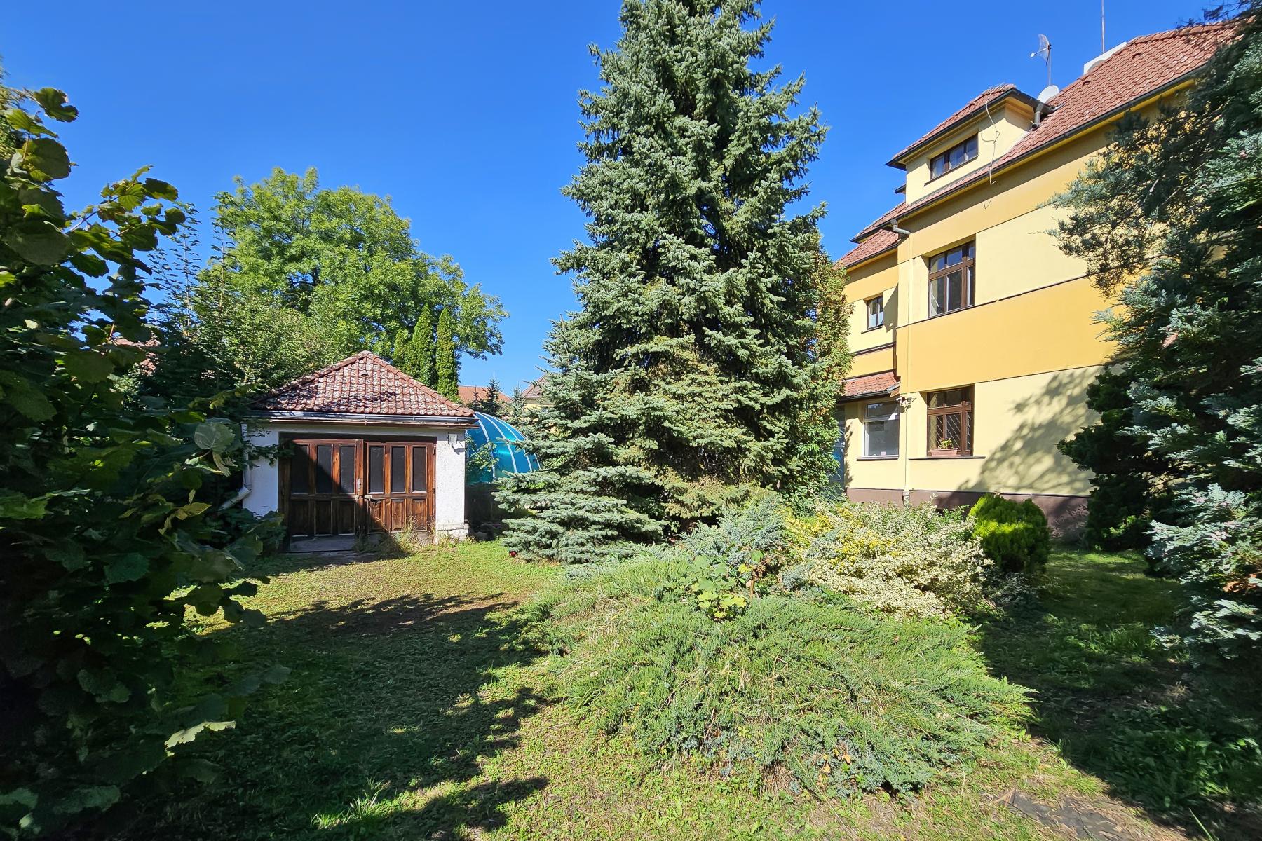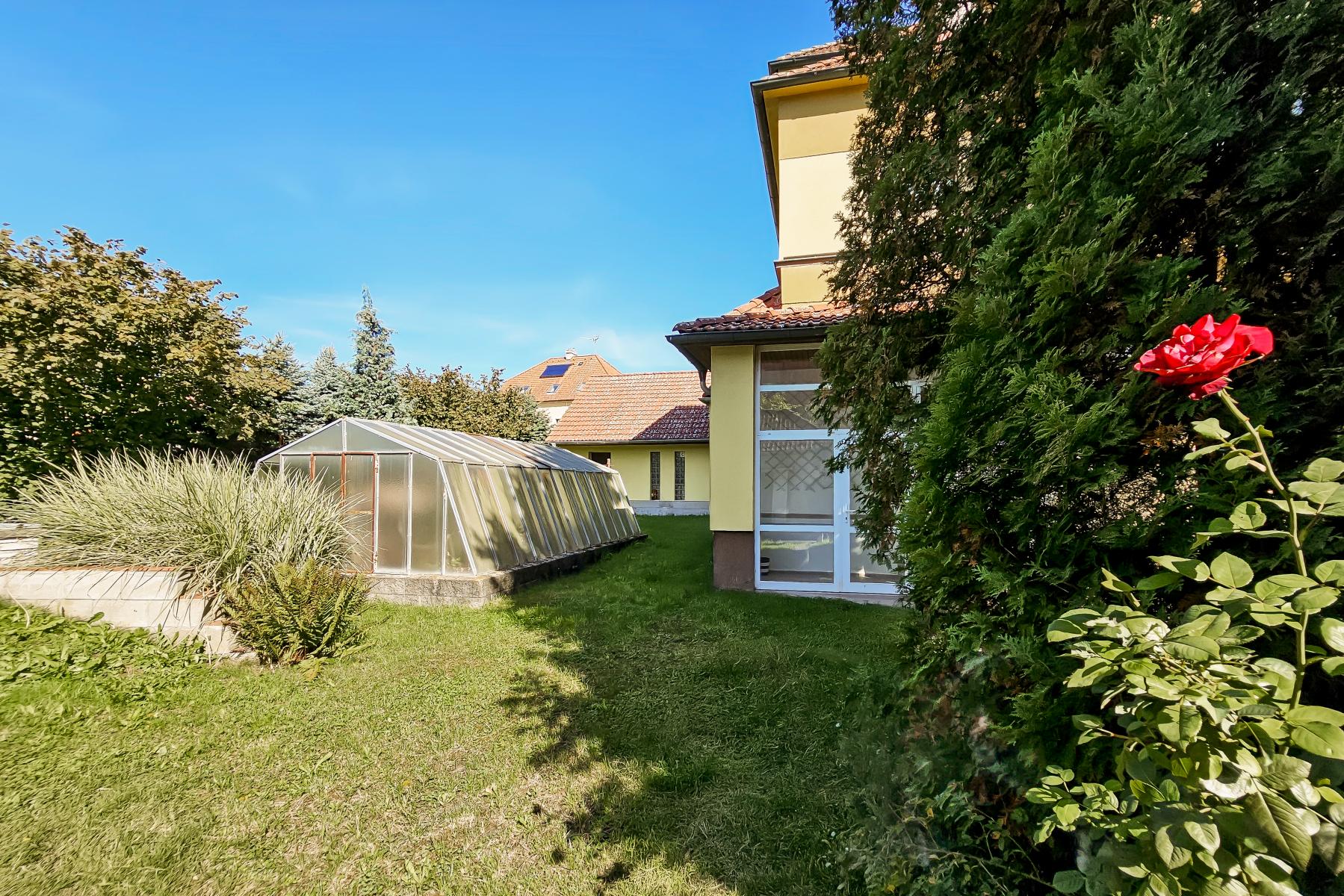 Na zahradě o ploše 640 m2 se nachází skleník a bazén (vyžadující renovaci), vzrostlé stromy a okrasné keře.