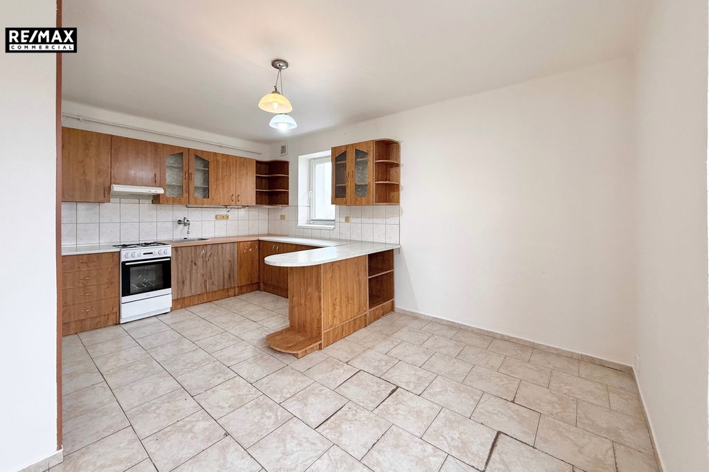 Byt tvoří vstupní chodba, prostorná kuchyně (20,4 m²) navazuje na obývací pokoj s krbem (19,1 m²). V bytě jsou dále dvě ložnice (9,9 m² a 15,6 m²) s přístupem z chodby, dále koupelna a samostatné WC. Obývací pokoj a obě ložnice jsou orientovány okny na jih. Byt je v dobrém technickém stavu a ihned obyvatelný, přesto vybízí k drobným rekonstrukcím (např. výměna podlah nebo kuchyně).