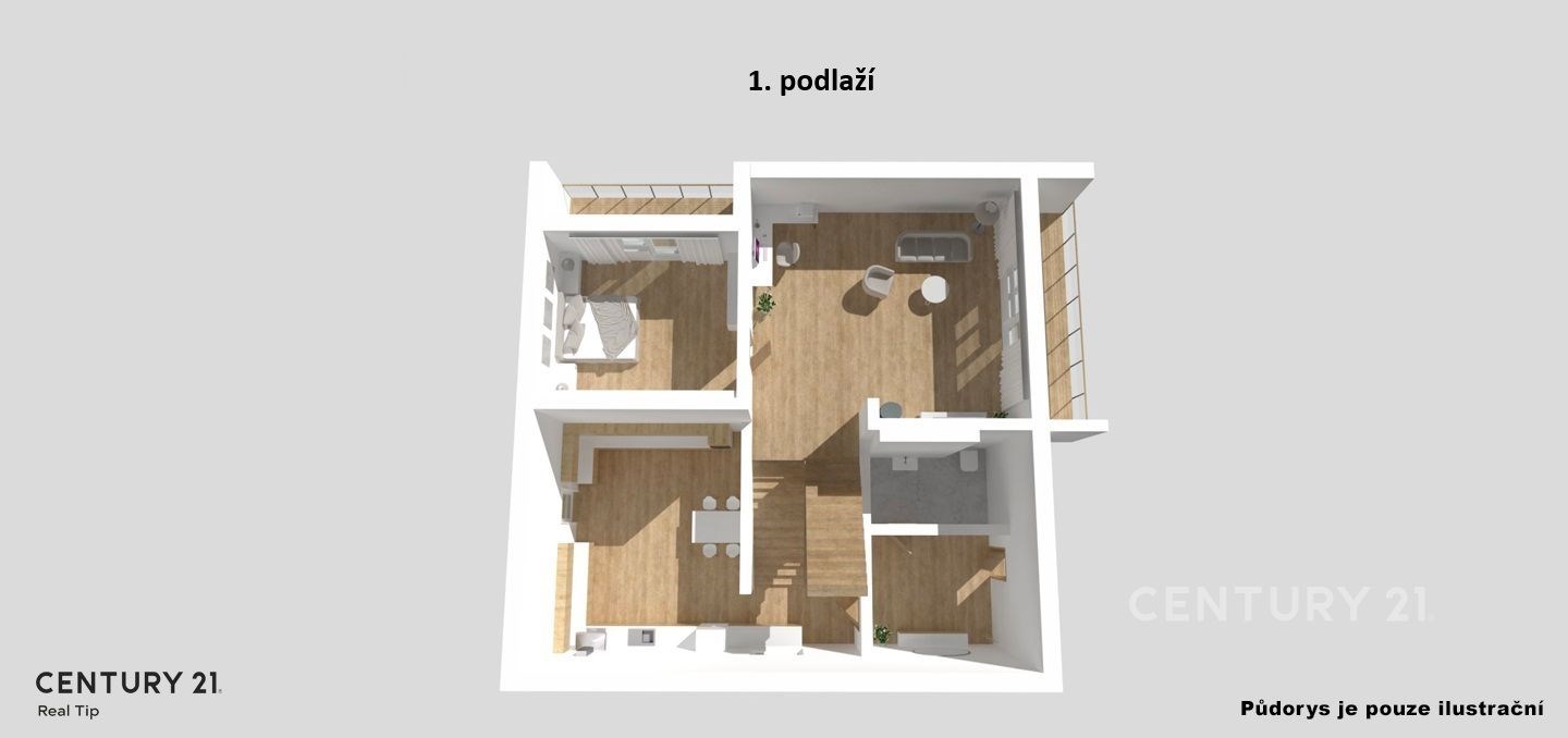 V prvním nadzemním podlaží je garáž, která má 24 m2, kuchyně s krásnou kuchyňskou linkou a přímým průchodem na terasu, samostatná toaleta, komora, prostorný obývací pokoj s kamny a balkonem a ložnice navazující na obývací část.