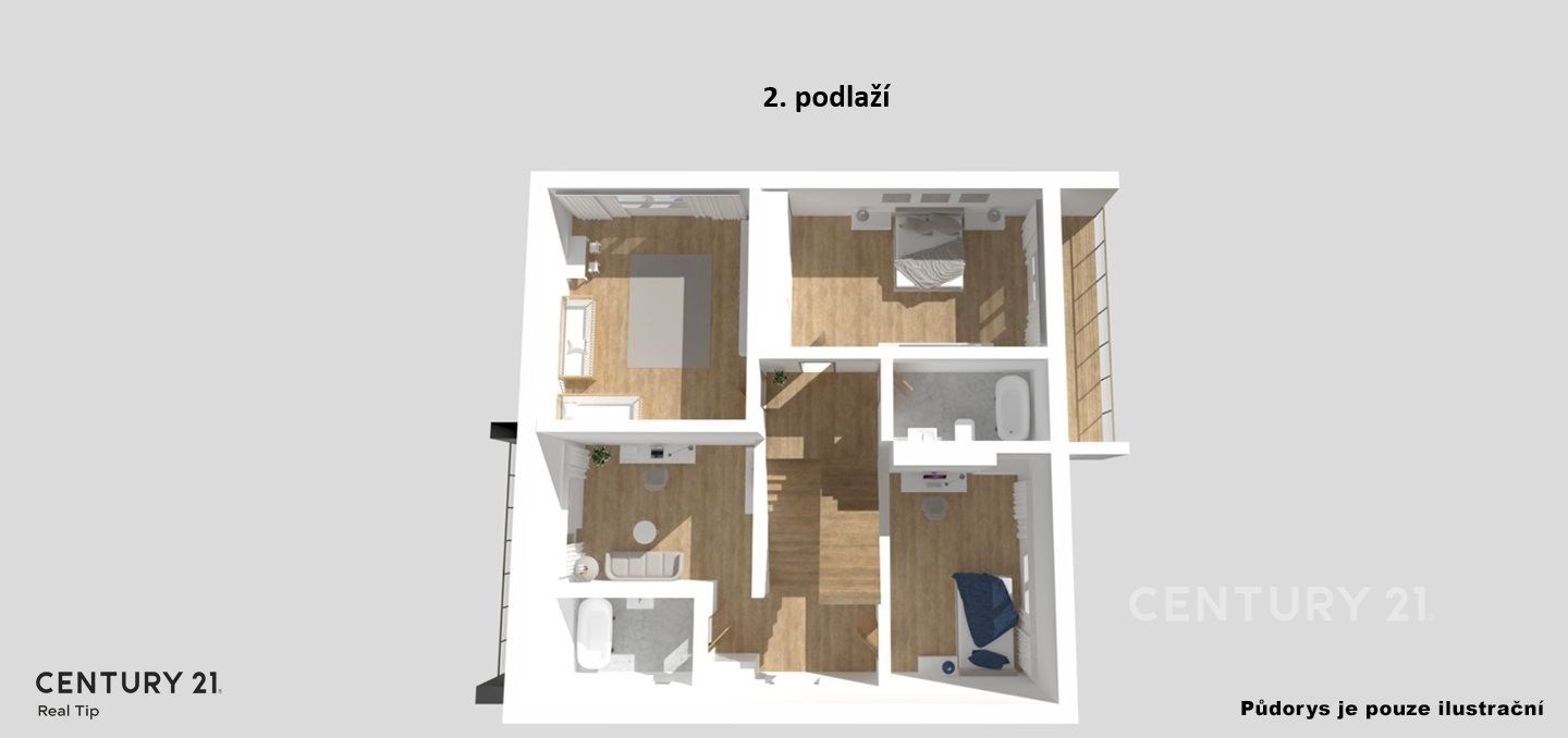 Ve druhém nadzemním podlaží najdete moderně zrekonstruovanou koupelnu s toaletou, dětský pokoj s balkonem a další pokoj, který lze využít například jako pracovnu.
