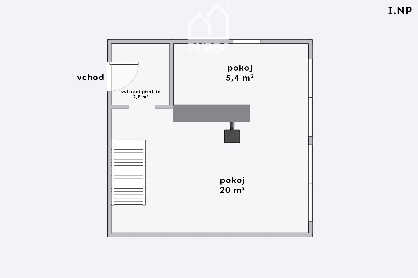 Horní patro (1. NP): přístup přímo z obecní komunikace, jde o klidovou část chaty s prostornou ložnicí, která je prosvětlená a orientovaná tak, abyste měli přehradu neustále na očích.