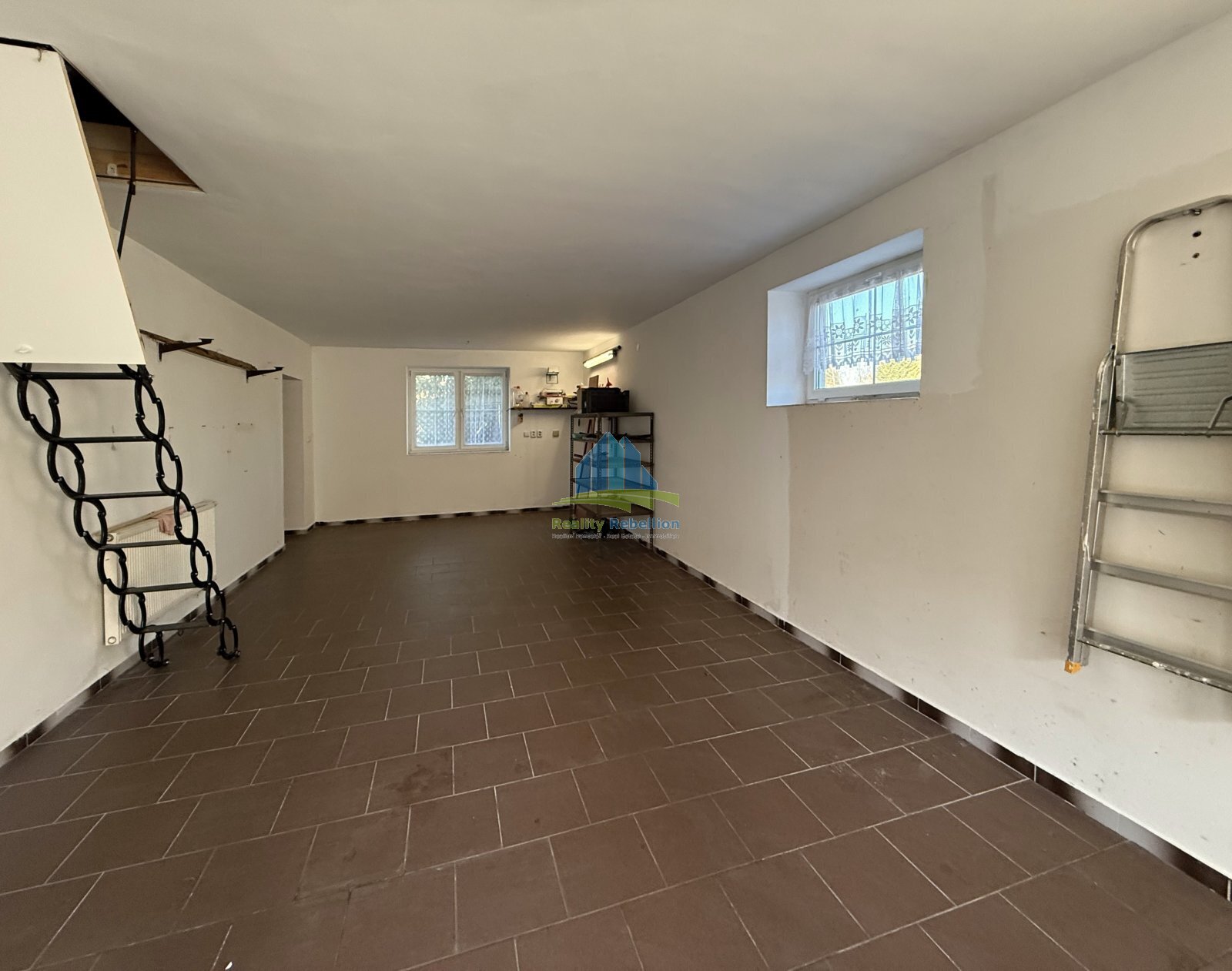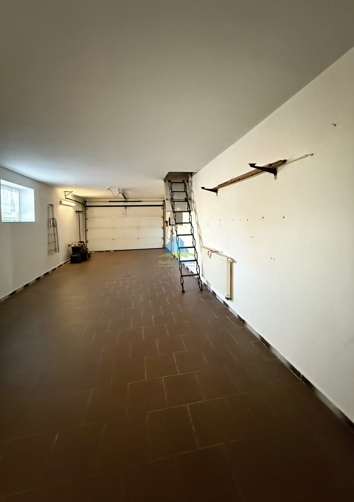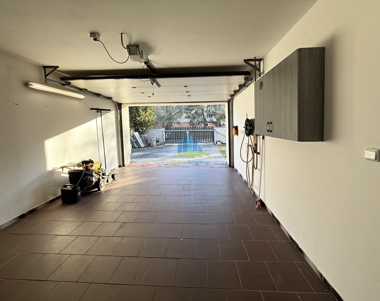 Intergrovaná garáž s vraty na dálkové ovládání s parkováním pro 2 automobily za sebou není s domem komunikačně propojena, ale je z ní vstup na krytou terasu, kam lze rovněž vstoupit z ložnice a obývacího pokoje. Z garáže lze po skládacích kovových schodech vystoupit do neupraveného podkrovního prostoru, kde lze vybudovat další bytovou jednotku nebo využít jako velkorysý úložný prostor. Kromě garáže je možno parkovat 3 automobily na vlastním pozemku a další před domem na veřejné komunikaci.