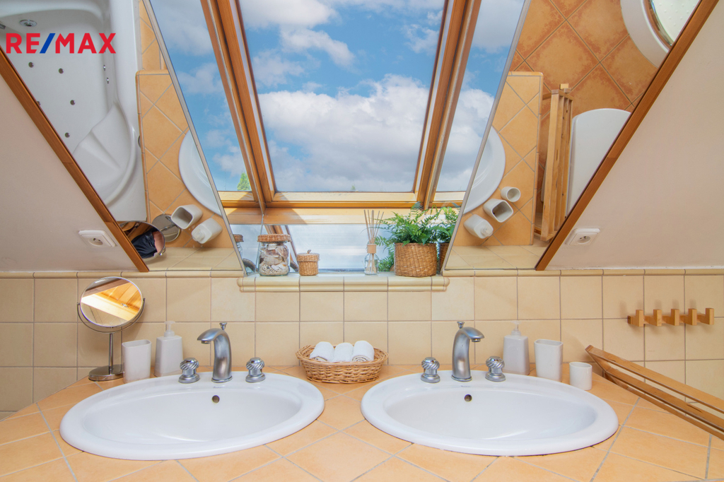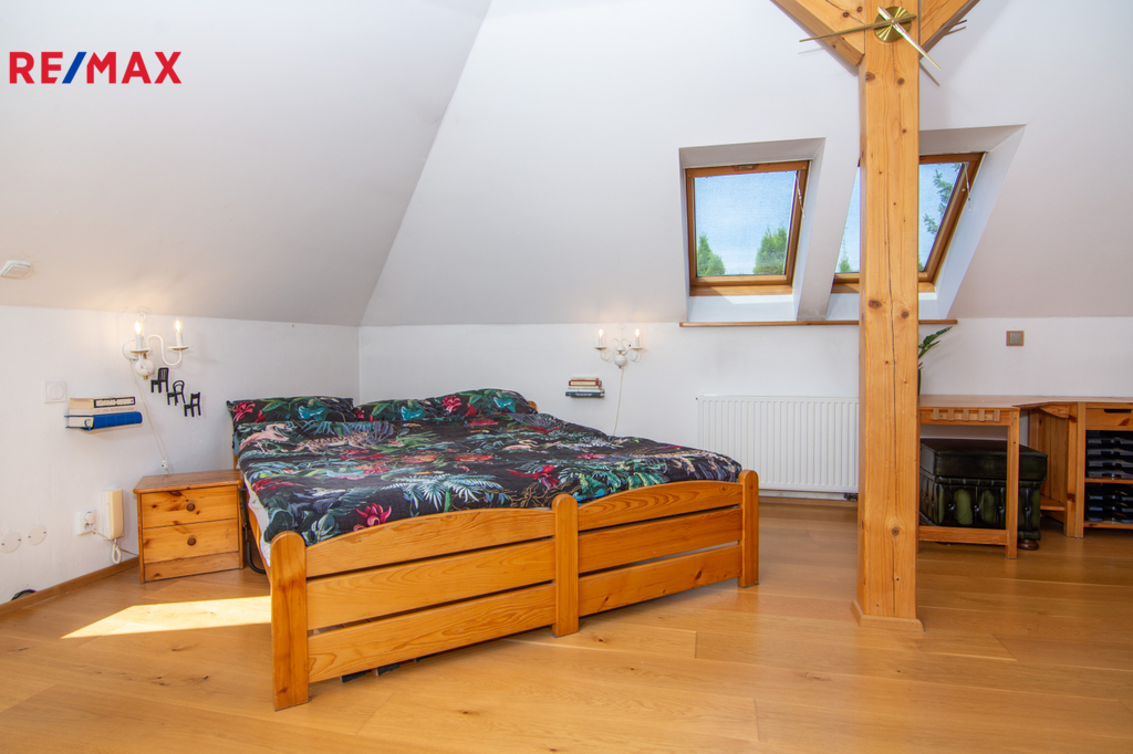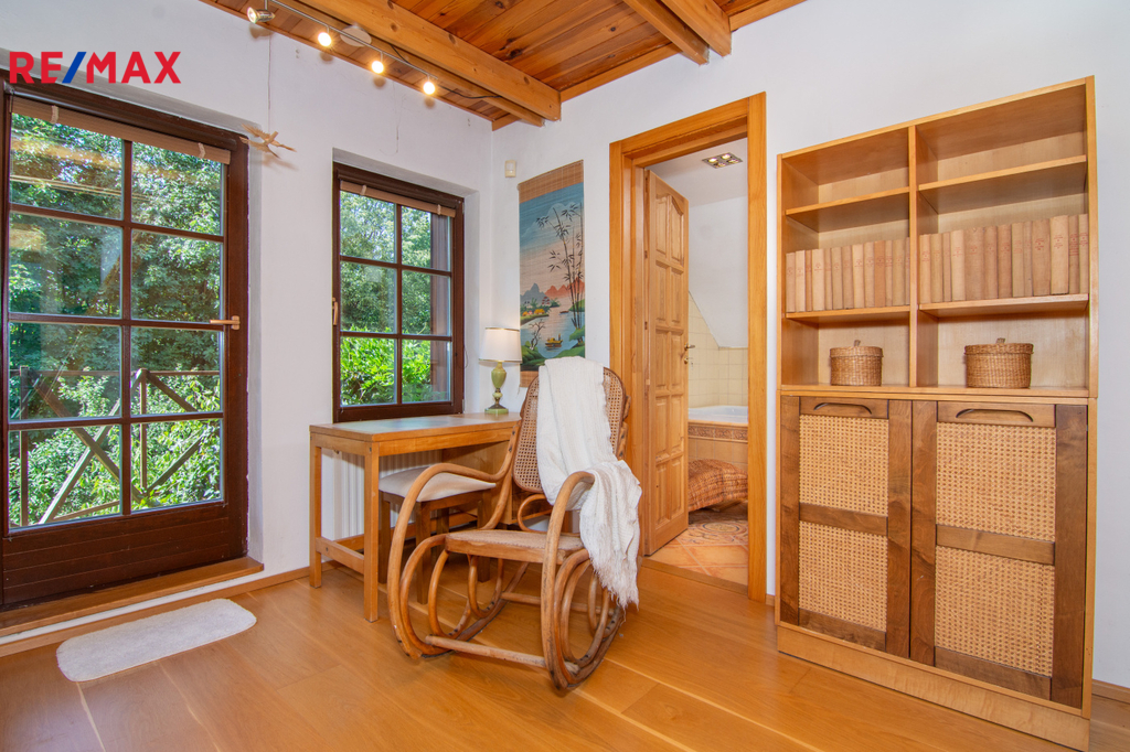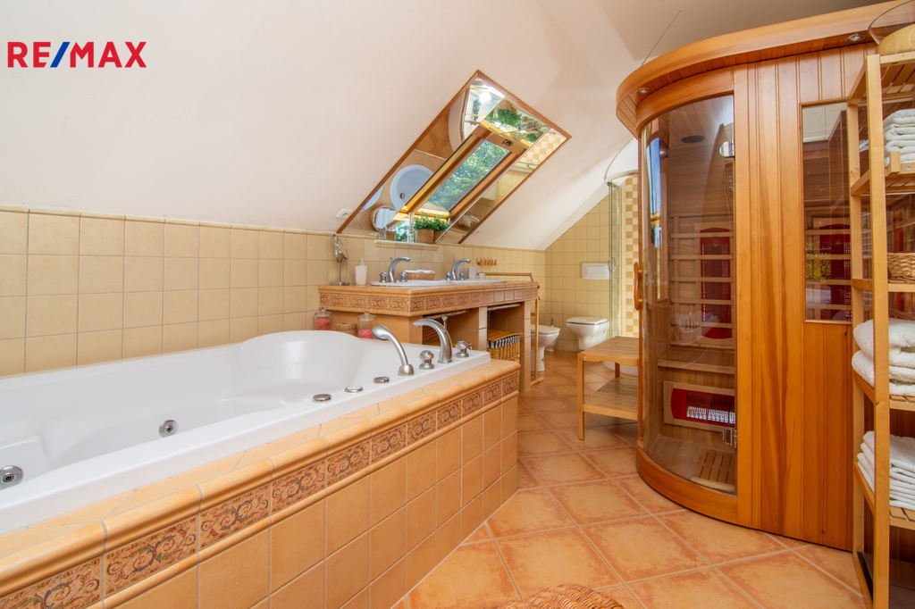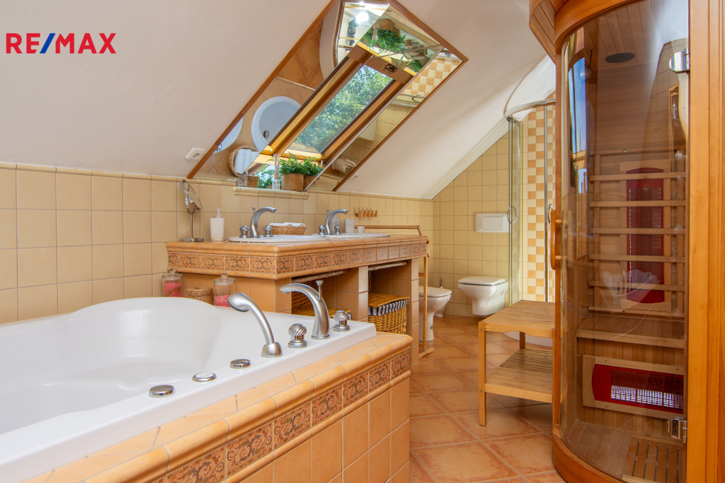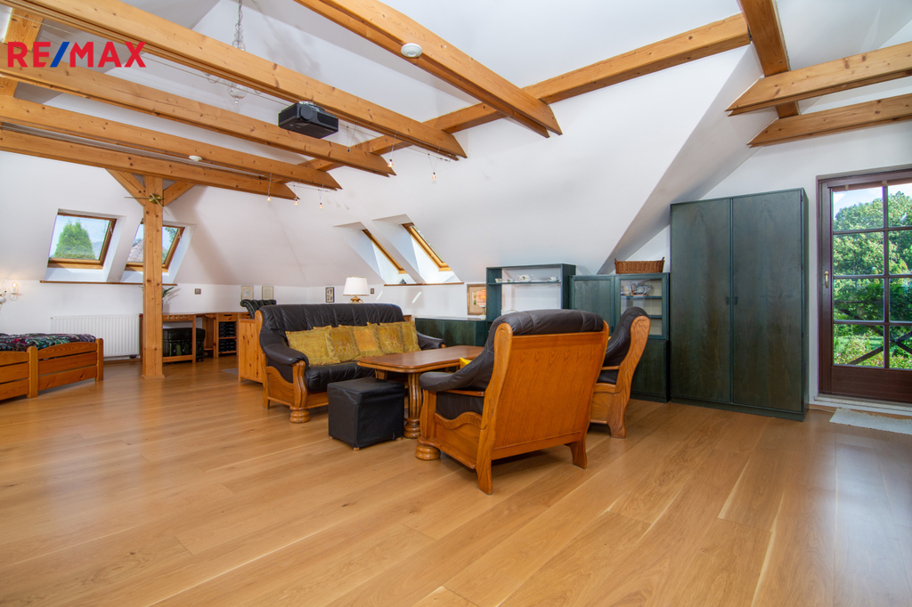 V patře se nachází ložnice (14,3 m2), další samostatný pokoj (18,2 m2) a velkoprostorový pokoj (31,4 m2), jenž můžete využít jako dětský pokoj, pracovnu nebo hernu. Patro navíc zahrnuje koupelnu (11,1 m2) s hydromasážní vanou a infrasaunou, přičemž všechny horní místnosti mají vstup na balkon s výhledem do zeleně.