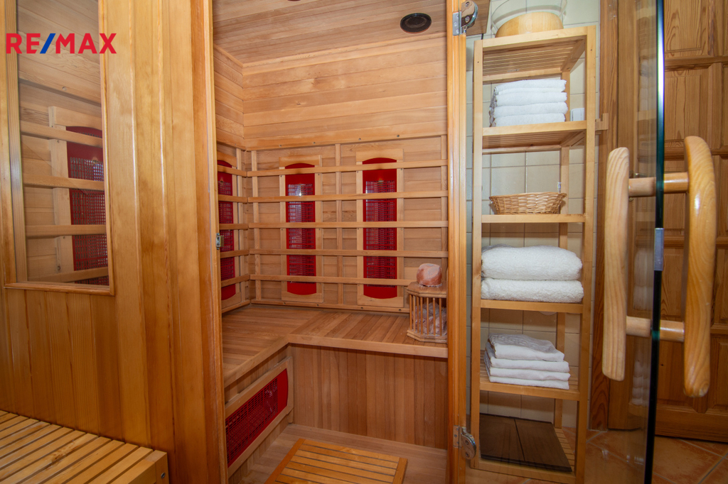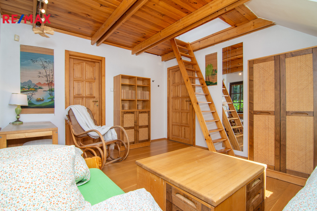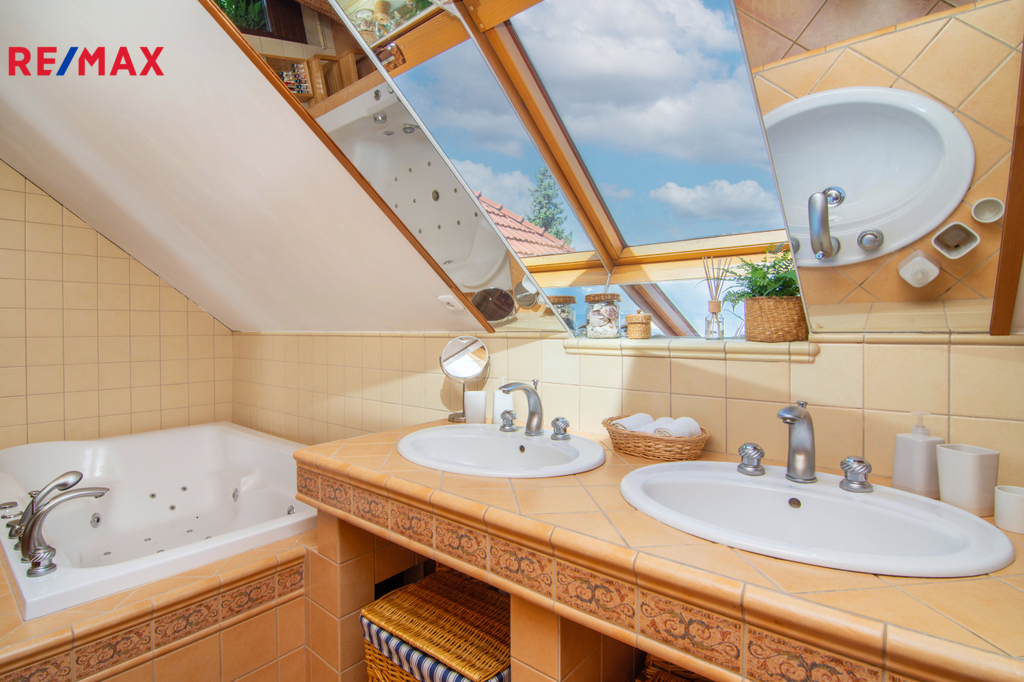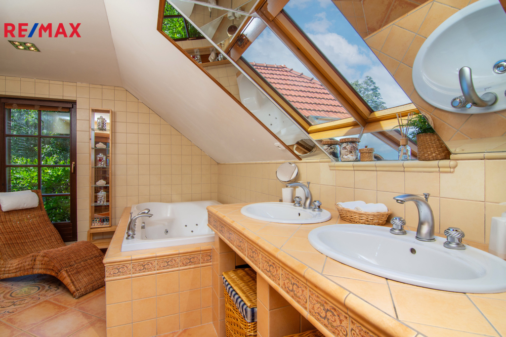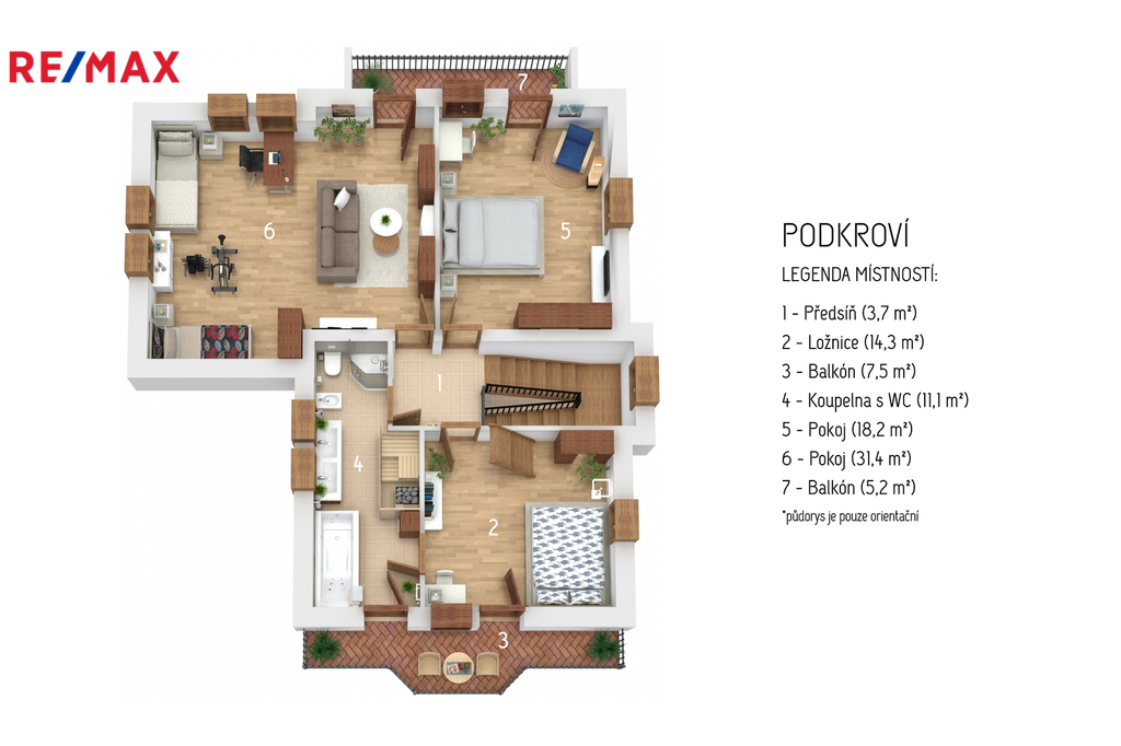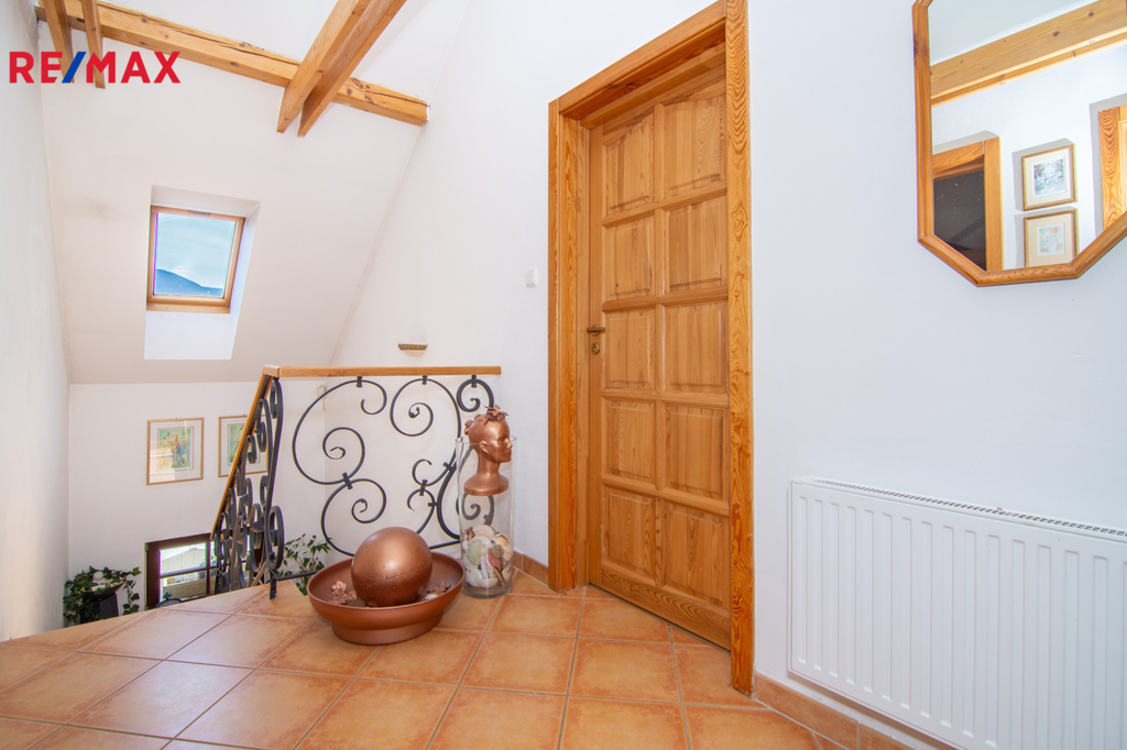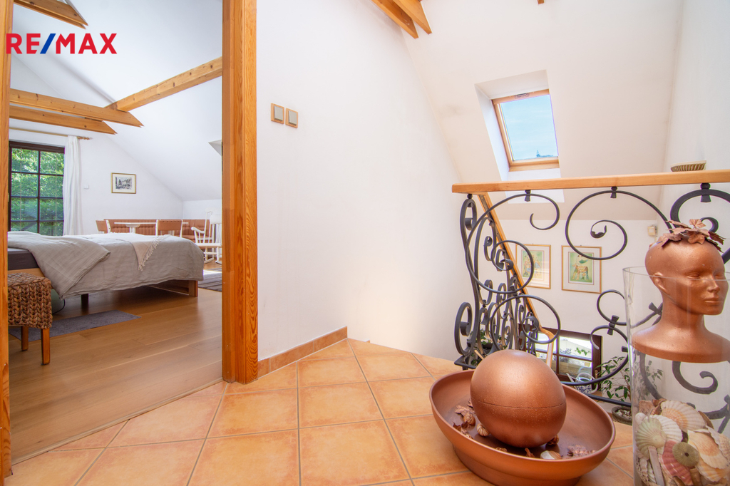 V patře se nachází ložnice (14,3 m2), další samostatný pokoj (18,2 m2) a velkoprostorový pokoj (31,4 m2), jenž můžete využít jako dětský pokoj, pracovnu nebo hernu. Patro navíc zahrnuje koupelnu (11,1 m2) s hydromasážní vanou a infrasaunou, přičemž všechny horní místnosti mají vstup na balkon s výhledem do zeleně.