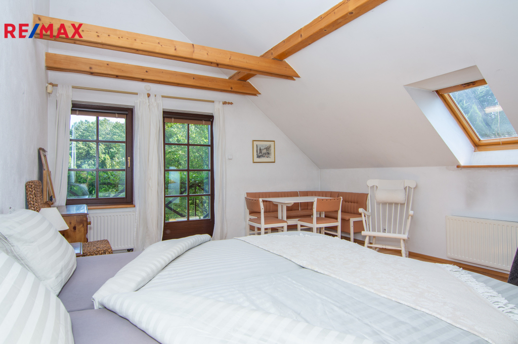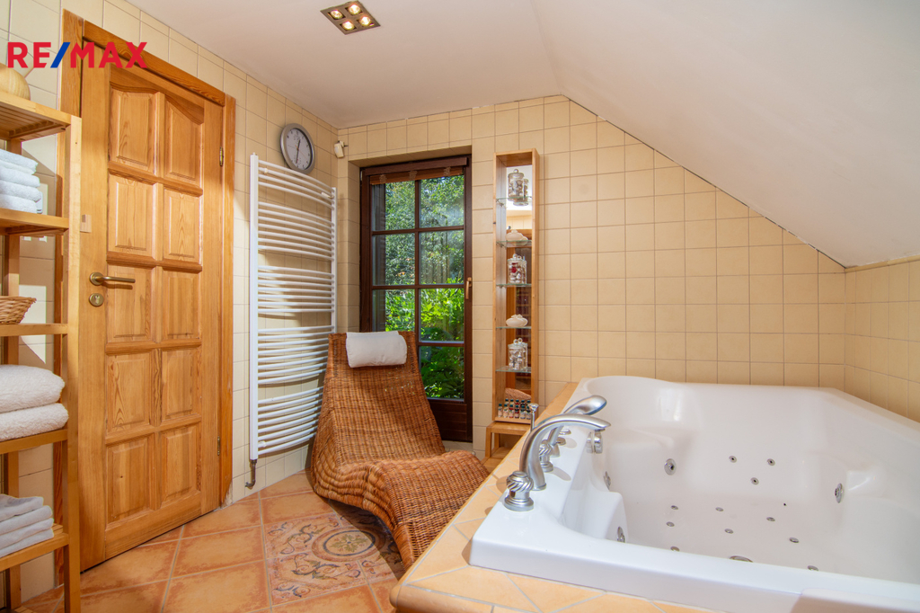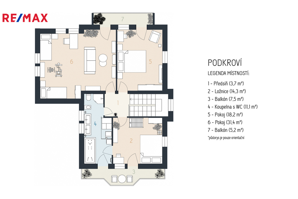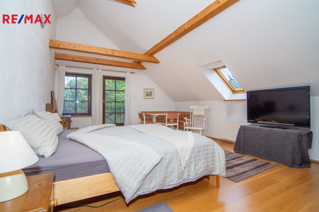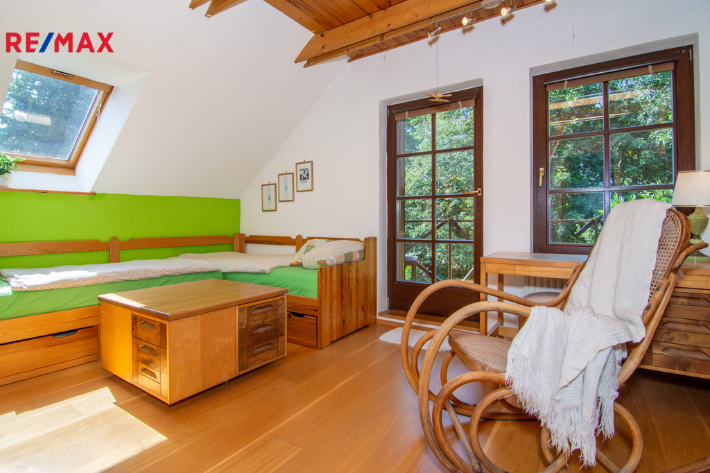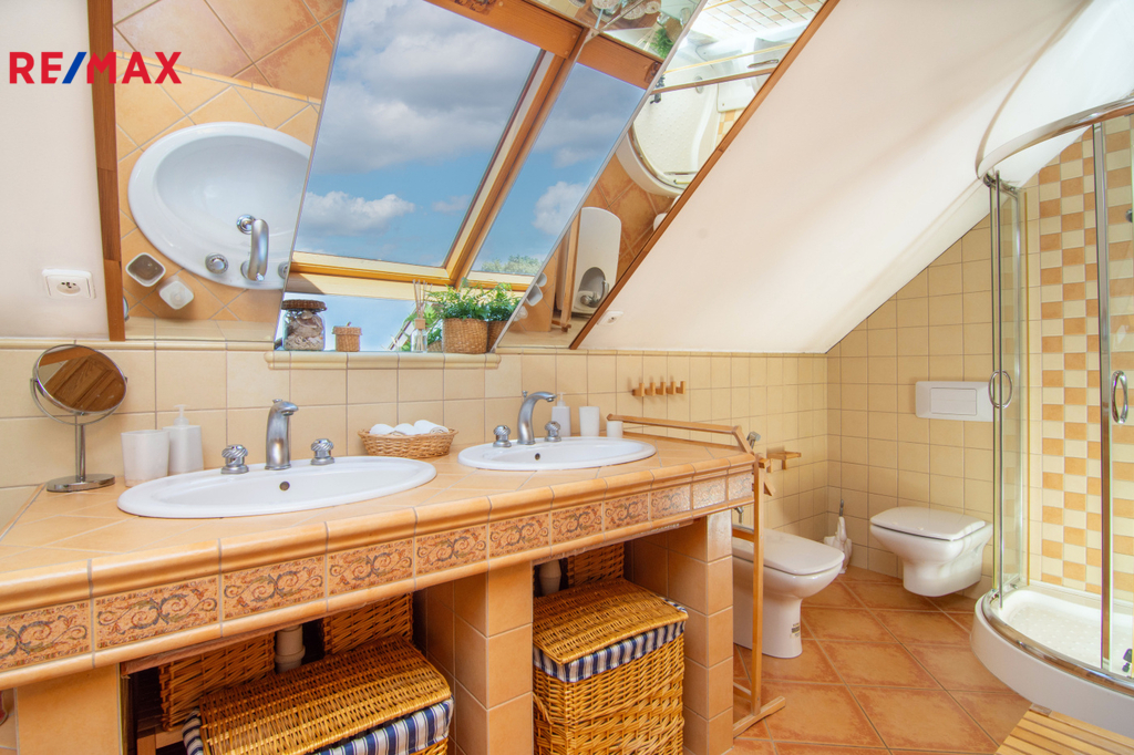 V patře se nachází ložnice (14,3 m2), další samostatný pokoj (18,2 m2) a velkoprostorový pokoj (31,4 m2), jenž můžete využít jako dětský pokoj, pracovnu nebo hernu. Patro navíc zahrnuje koupelnu (11,1 m2) s hydromasážní vanou a infrasaunou, přičemž všechny horní místnosti mají vstup na balkon s výhledem do zeleně.