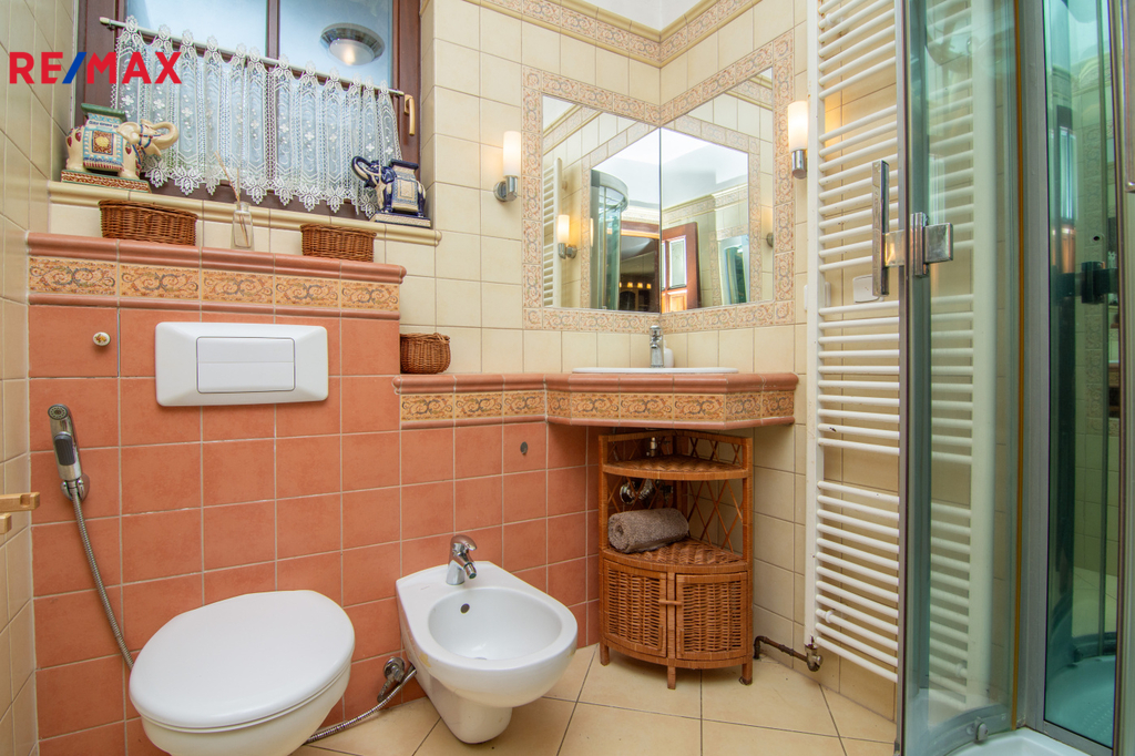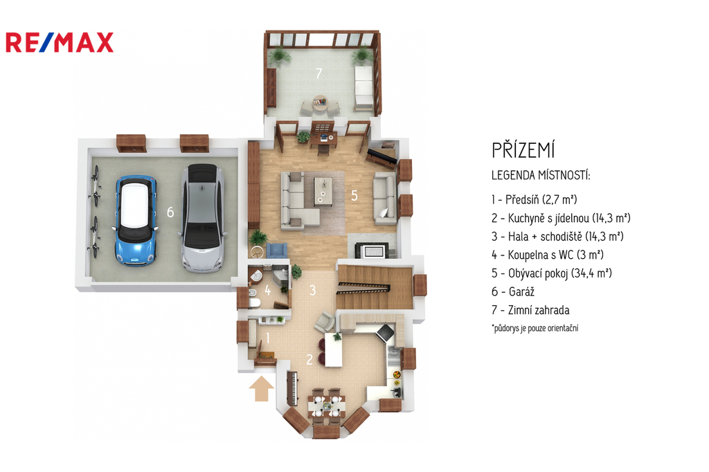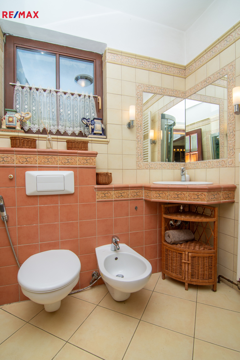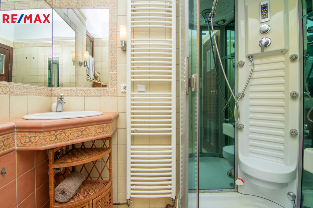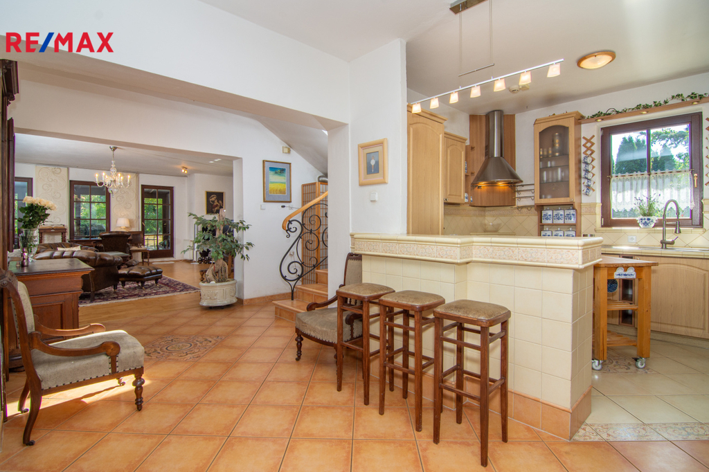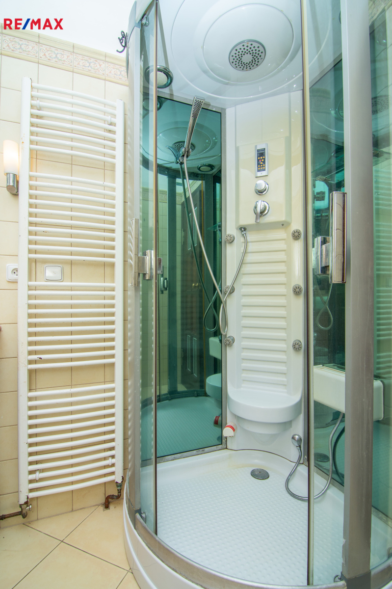 Dům má celkovou zastavěnou plocha 156 m² a nabídne ideální prostory pro rodinné bydlení. Promyšlené dispoziční řešení a dostatek prostoru umožňují možnost vytvořit samostatnou bytovou jednotku, což je skvělá příležitost k pronájmu a zajímavému pasivnímu příjmu. Interiér je kompletně vybaven a nabízí přízemní kuchyň s jídelním koutem )14,3 m2) a prostorný obývací pokoj (34,4 m2) s krbem a přímým vstupem do zimní zahrady, ideálního prostoru pro celoroční relaxaci. V přízemí najdete také koupelnu s parním sprchovým boxem, WC a bidetem (3 m2).