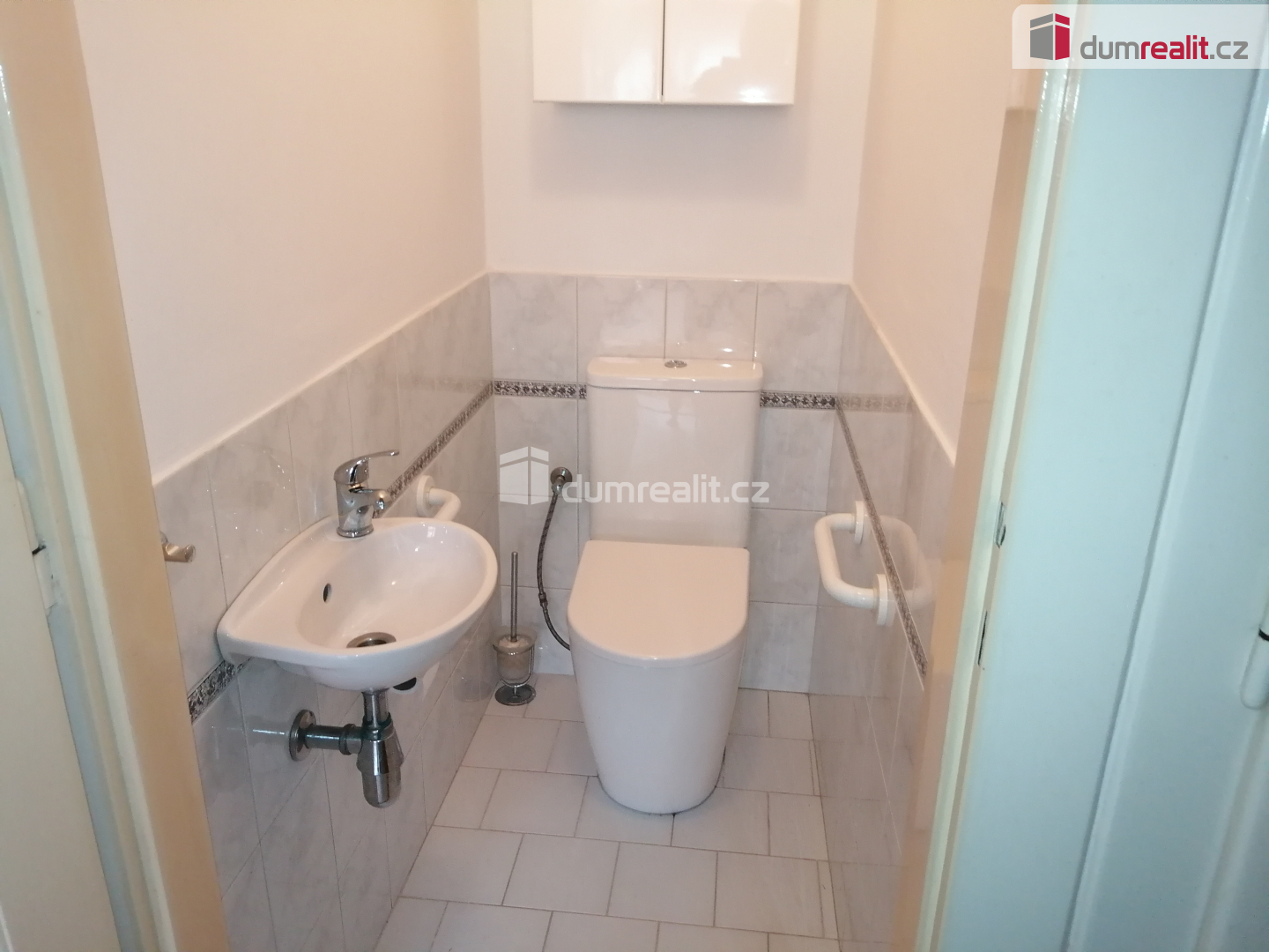 Samostatné WC, koupelna s nadstandardním sprchovým koutem, koupelnovým nábytkem, umyvadlem.