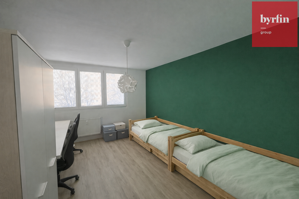 Dispozičně nabídne dvě samostatné ložnice, oddělenou kuchyň a obývací část řešenou otevřeně směrem k chodbě, což vytváří příjemný vzdušný dojem. Koupelna je vybavena sprchovacím koutem, toaleta je samostatná u vstupu, najdete zde také praktické místo pro pračku a sušičku.