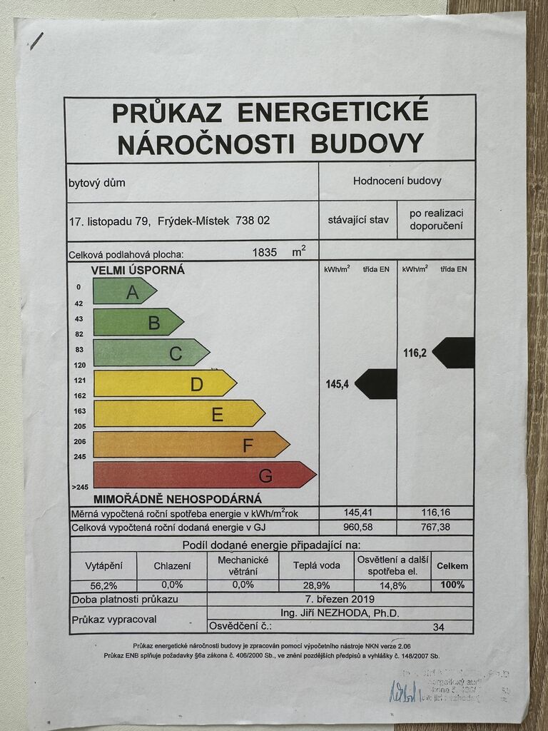 - Energetická náročnost budovy: D - Méně úsporná