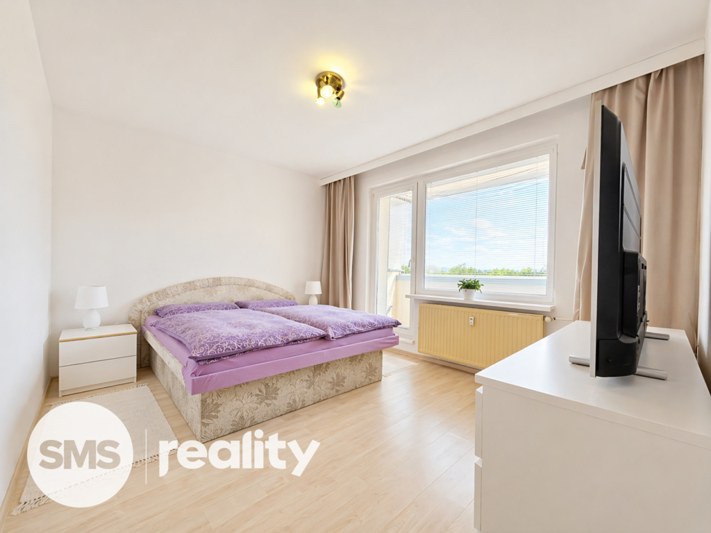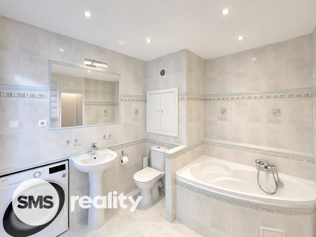 Dále z předsíně pokračujete do menšího pokoje, ideálního jako dětský pokoj či pracovna, aktuálně je pokoj využíván pro uskladnění, před stěhováním - viz. vizualizace. Na pravé straně se nachází prostorná koupelna s rohovou vanou a toaletou. Z koupelny je vstup do samostatné ložnice, ze které je přímý vstup na lodžii – ideální místo pro ranní kávu či relax.