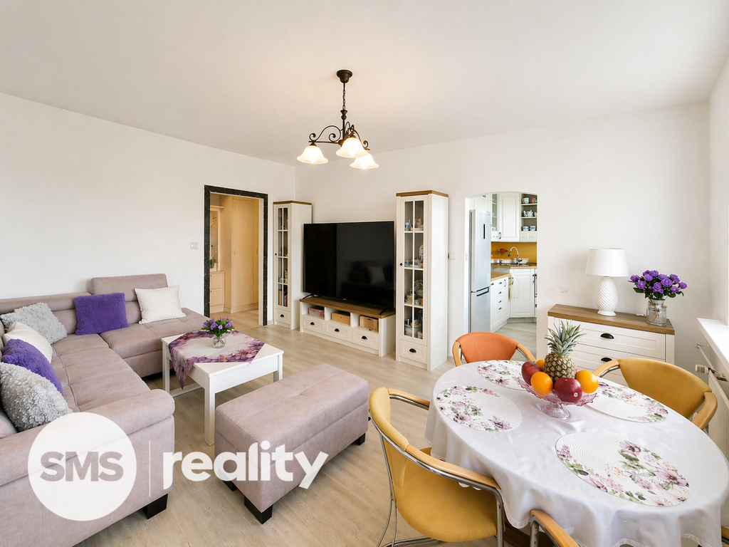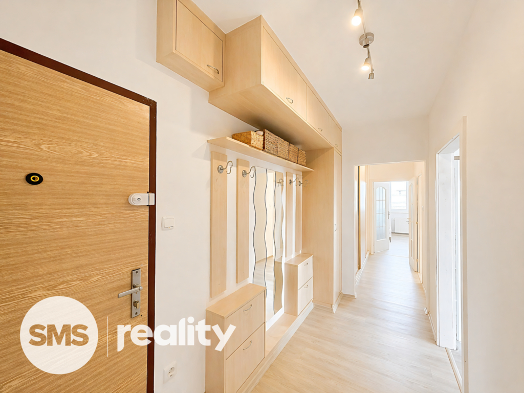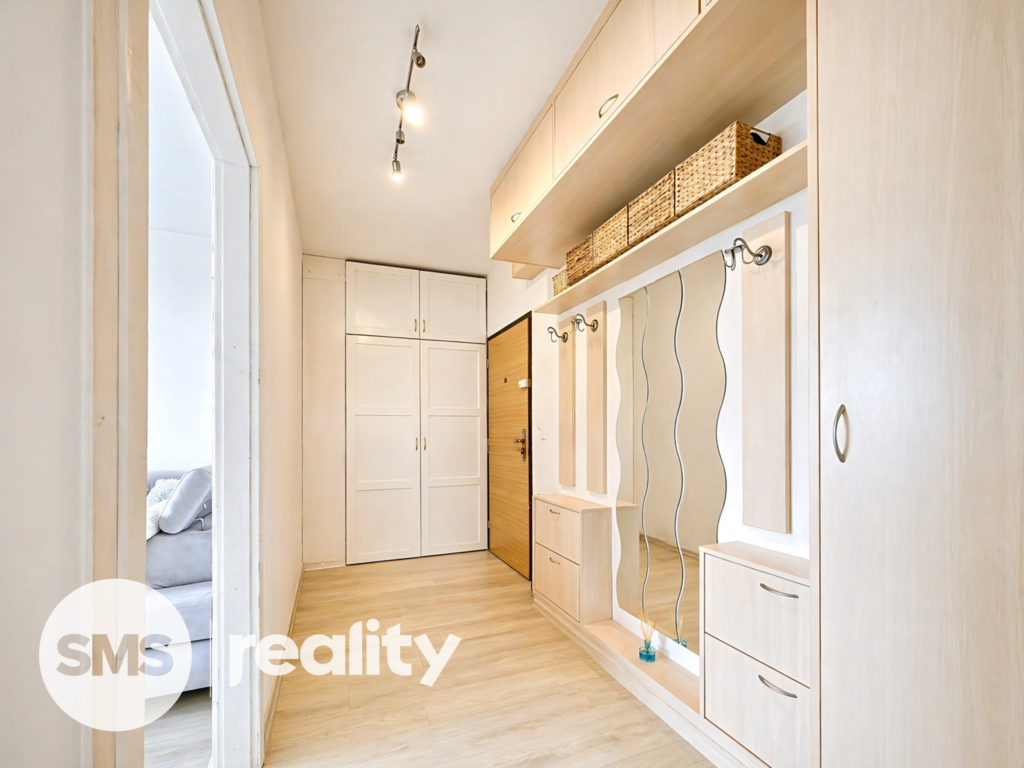Dispozice bytu je velmi praktická a promyšlená. Po vstupu se ocitnete v prostorné předsíni s vestavěnými skříněmi, botníkem, věšákem a zrcadlem, které jsou součástí prodeje. Z předsíně je vstup do obývacího pokoje s jídelním koutem, který plynule navazuje na samostatnou kuchyň vybavenou kuchyňskou linkou na míru a vestavěnými elektrospotřebiči, které jsou součástí prodeje - myčka na nádobí, elektrická trouba a indukční varná deska, digestoř, možno ponechat také mikrovlnnou troubu.
