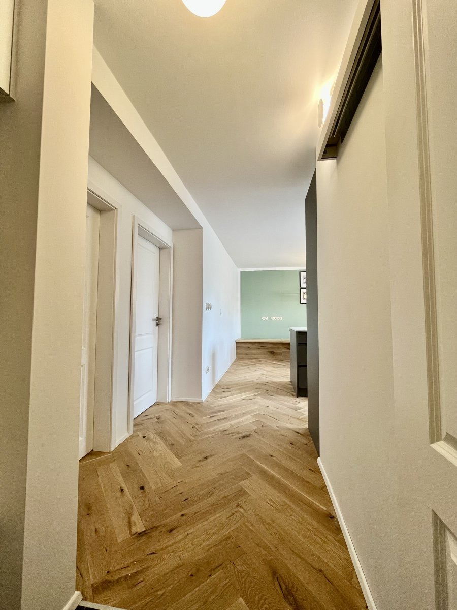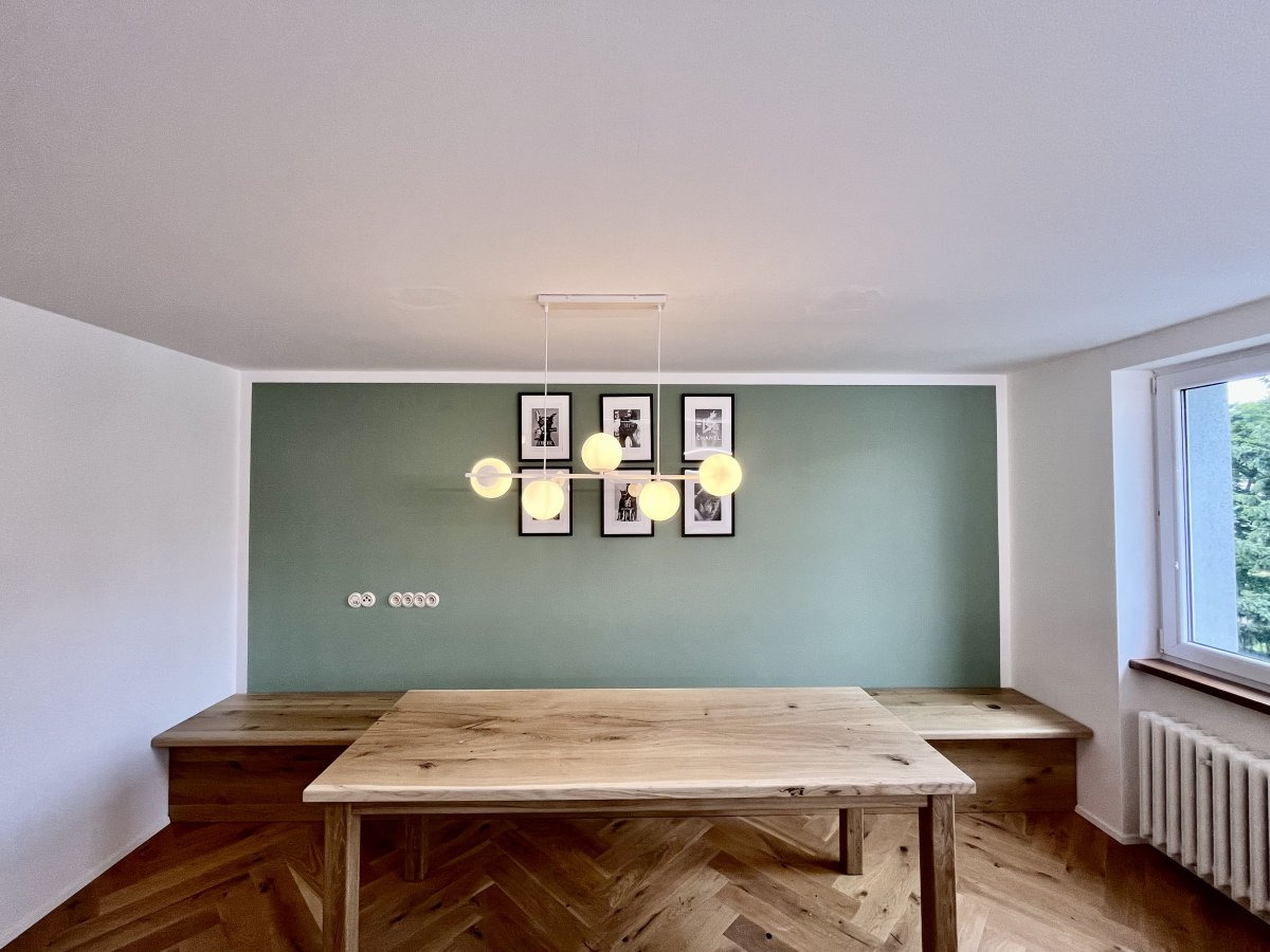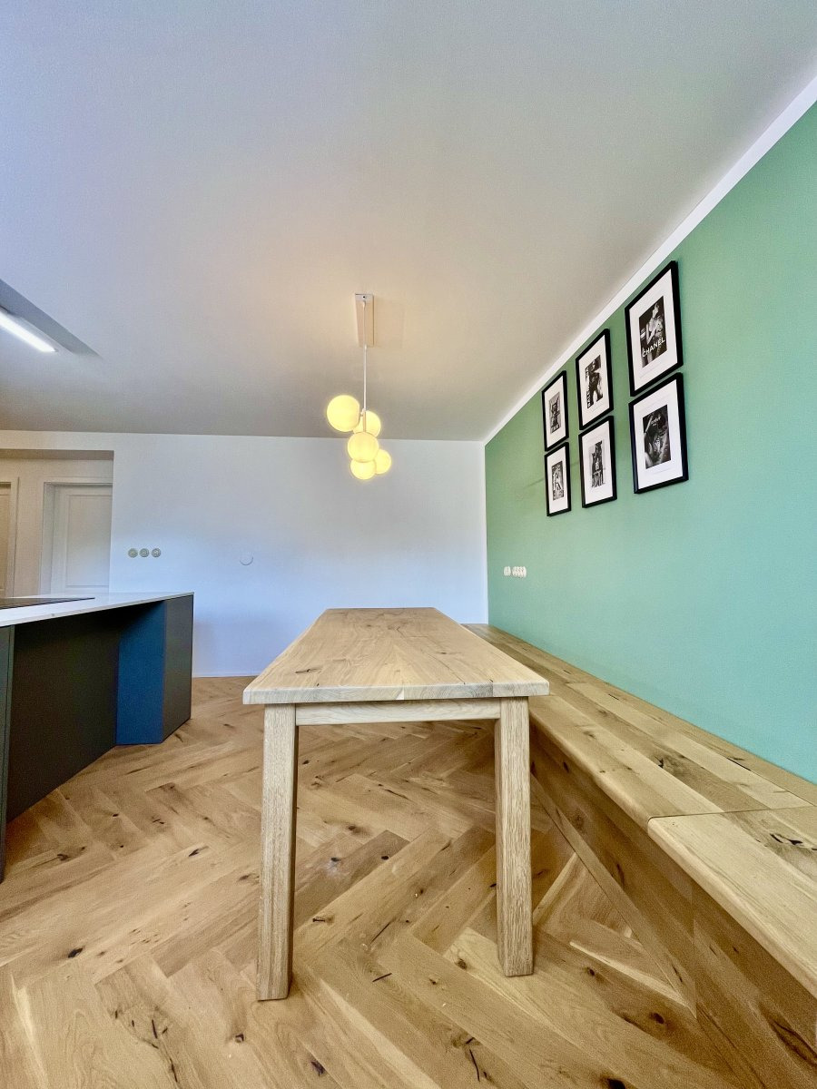 Byt prošel kompletní a moderní rekonstrukcí s použitím nadstandardních materiálů. Veškerý nábytek je vyrobený z masivního dřeva, kuchyňská pracovní deska je tvořena z jednoho kusu mramoru. Kvalitní podlahy, nové rozvody elektřiny i interiérové dveře jsou samozřejmostí. Stylově laděné vypínače a zásuvky v retro provedení dodávají interiéru osobitý a elegantní charakter.